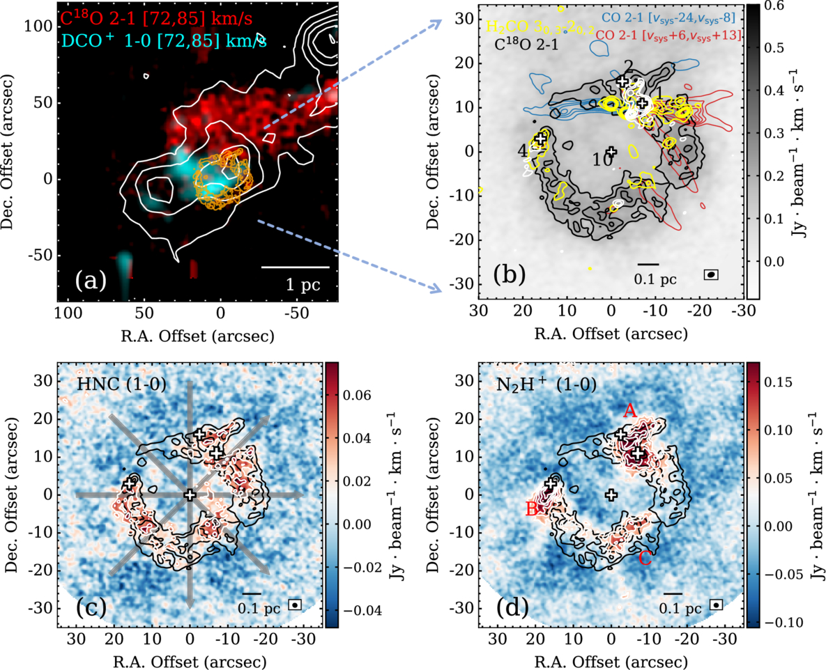(a) Integrated intensity map of C18O (2–1) from ALMA 12m+7m+TP data with full UV coverage, integrated over the velocity range 79.9–81.9 km s−1, overlaid on large-scale two-color maps of G34.74−0.12. The red and cyan colors represent the integrated intensities of C18O (2–1) and DCO+ (1–0), respectively, over the velocity range of 72–85 km s−1, obtained from IRAM-30 m observations (S. Feng et al. 2020). White contours represent the dust continuum emission from the combined Planck and APEX 870 μm map of the ATLASGAL survey, shown at contour levels of 4σ, 5σ, 6σ, 7σ, and 8σ, where σ = 0.18 Jy beam−1. The orange contours represent the C18O (2–1) gas ringlike structure with levels starting from 10σ and increase in steps of 3σ (1σ = 0.02 Jy beam−1 km s−1). The relative coordinate center (0, 0) denotes the center of the ring. (b) The grayscale map and black contours represent the integrated intensity of the C18O (2–1) ring (integrated velocity range: 79.9–81.9 km s−1). The contour level are same as (a). The blue and red contours represent the blue- and redshifted components of outflows traced by CO (2–1), respectively (S. Lin et al. 2025). The yellow contours represent the integrated intensity of H2CO (30,3–20,2) within the same integrated velocity range of C18O (2–1), showing a similar ringlike morphology. The contour levels of H2CO start from 4σ and increase in steps of 4σ (1σ = 0.01 Jy beam−1 km s−1). The white contours represent the 1.3 mm dust continuum from ASHES observations. White crosses outlined in black mark the positions of cores 1, 2, 4, and 10, as labeled by K. Morii et al. (2023). (c) C18O (2–1) ring overlaid on the integrated intensity map of HNC (1–0). The black contours represents the C18O (2–1) gas ringlike structure, same as (a). The white contours represents the HNC (1–0) emission with levels starting from 3σ and increasing in steps of 2σ (1σ = 0.012 Jy beam−1 km s−1), integrated over the same integrated velocity range of C18O (2–1). The gray arrows indicate the paths along four different directions, corresponding to a P.A. of 0°, 45°, 90°, and 135°. (d) C18O (2–1) ring overlaid on the integrated intensity map of N2H+ (1–0), derived by stacking its hyperfine components. The black contours represent the C18O (2–1) gas ringlike structure, same as panel (a). The white contours represent the N2H+ (1–0) emission with levels starting from 3σ and increasing in steps of 2σ (1σ = 0.019 Jy beam−1 km s−1), integrated over the same integrated velocity range of C18O (2–1). A, B, and C mark the positions where HNC (1–0), N2H+ (1–0), and C18O (2–1) lines all show emissions S/N > 4. The synthesized beam for each line is shown in the bottom right corner of each panel.