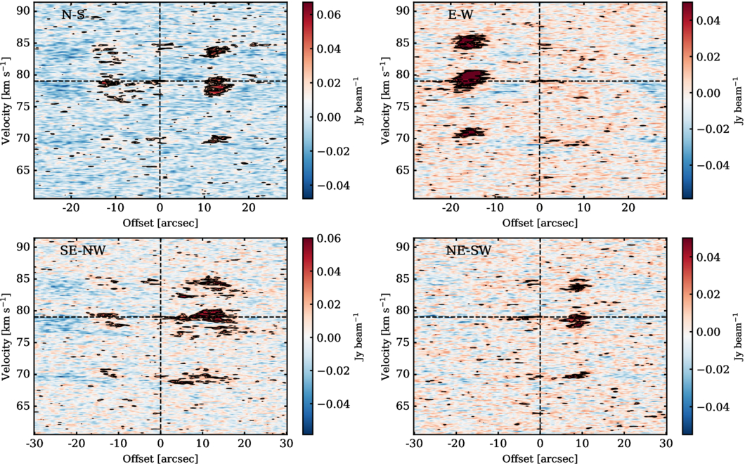 PV diagrams of N2H+ (1–0) along four cuts with a P.A. of 0°, 45°, 90°, and 135° (labeled in Figure 1) of the ringlike structure. Contour levels are set at 3σ, 4σ, and 5σ, where σ = 0.008 Jy beam−1.