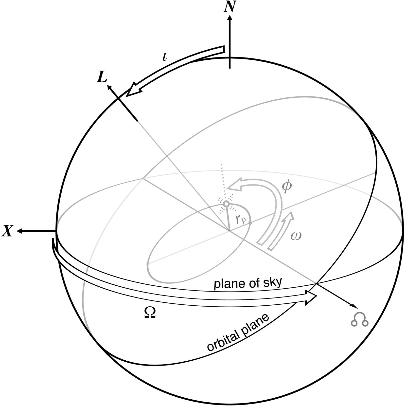 Relationship between the orbital elements and the GW coordinate frame. The direction from the source to Earth is N, and the vector X defines a reference direction on the transverse plane (the plane of the sky). The inclination ι is the angle between N and the orbital angular momentum vector L. The longitude of the ascending node of the orbit Ω is the angle on the plane of the sky between X and the ascending node ♌, N × L. The angle Ω is degenerate with the polarization angle ψ. The orbit of the primary about the center of mass of the system is shown. The orbital phase ϕ is the angle on the orbital plane between the ascending node and position vector of the primary relative to the center of mass. For an eccentric orbit, the distance of the primary from the center of mass at periapsis is rp, and the argument of the periapsis ω for the primary is the angle on the orbital plane between the ascending node and the position vector of the primary at periapsis.