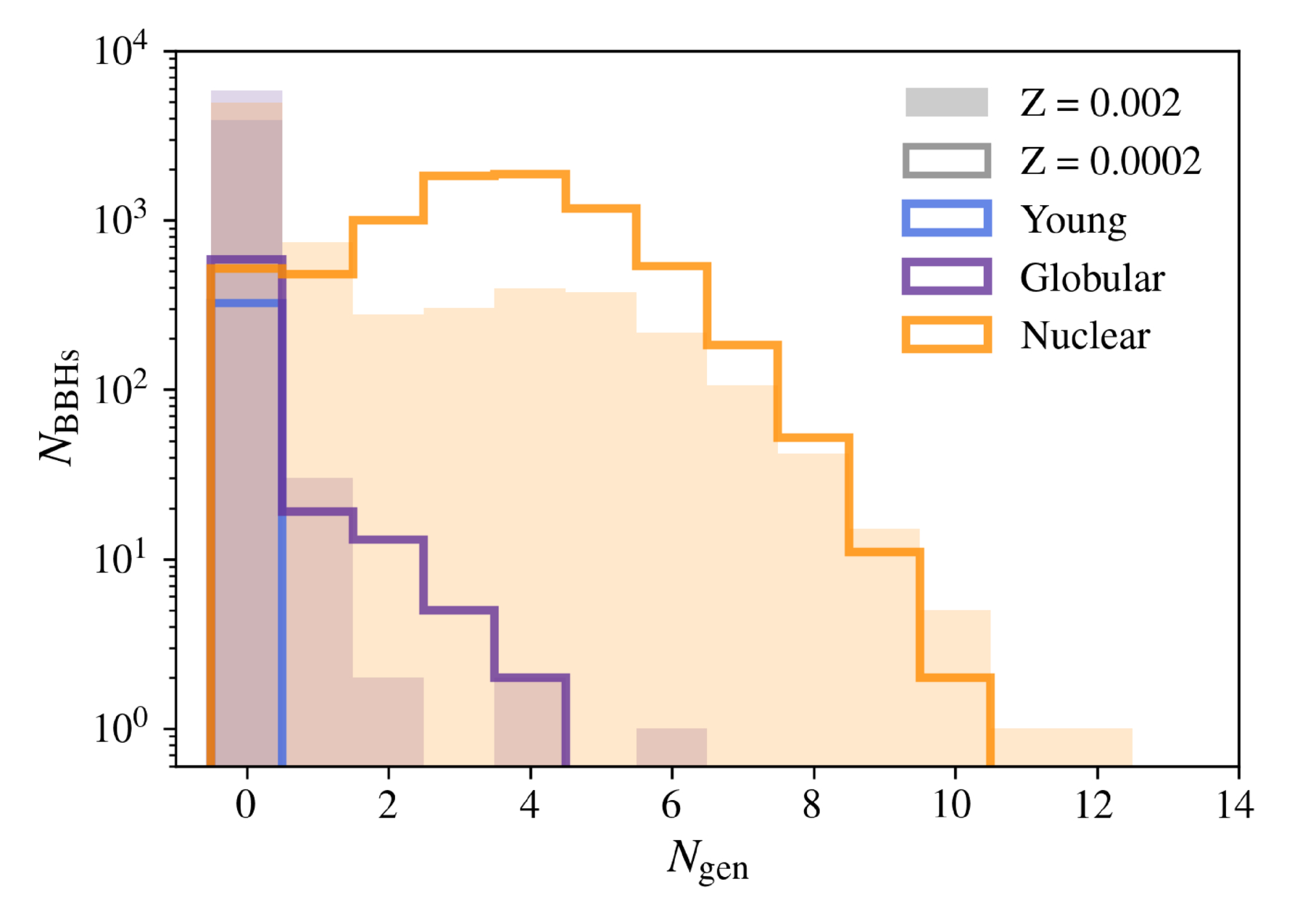 Distribution of primary BH generations for simulated BBH mergers with component masses in the 90% CI of GW231123. We distinguish between models with metallicity Z = 0.002 (filled steps) or Z = 0.0002 (open steps) and among YCs (blue steps), GCs (purple steps), and NCs (orange steps).