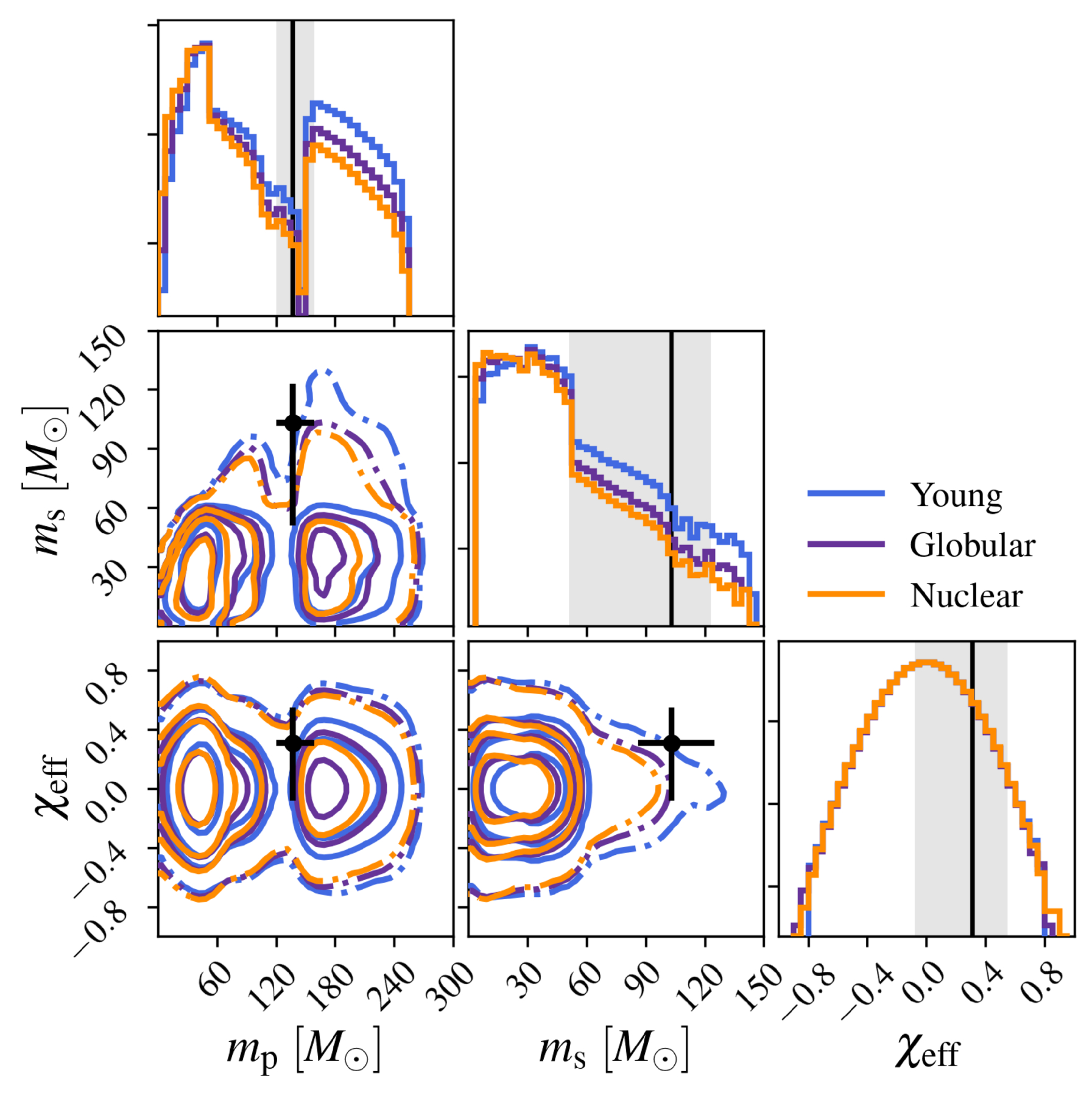 Masses and effective spin distributions for YCs, GCs, and NCs in our fiducial simulation. The metallicity is set to Z = 0.002. The contour lines refer to the 68%, 95%, 99% (solid line) and 99.99% (dotted–dashed line) contours. The 1D distributions are normalized to 1 and displayed in log scale.