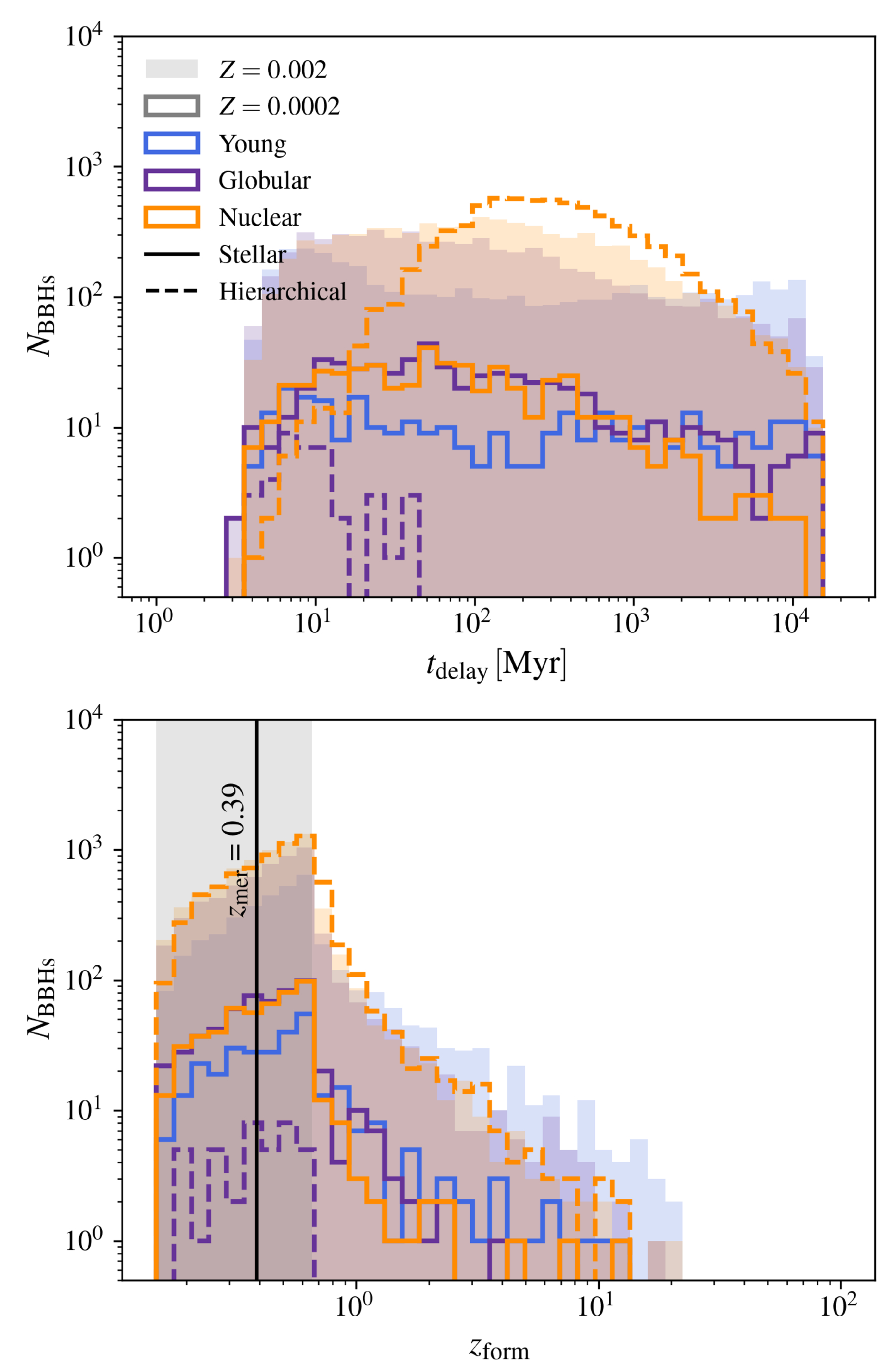 Delay times of mergers in the GW231123 mass CI for different cluster environments in our simulations. The filled histograms refer to Z = 0.002 runs, while the empty histograms refer to Z = 0.0002 runs. In the latter case, the solid lines refer to primary BHs undergoing a single merger event (“Stellar”), while the dashed lines refer to BHs that also underwent previous mergers (“Hierarchical”).