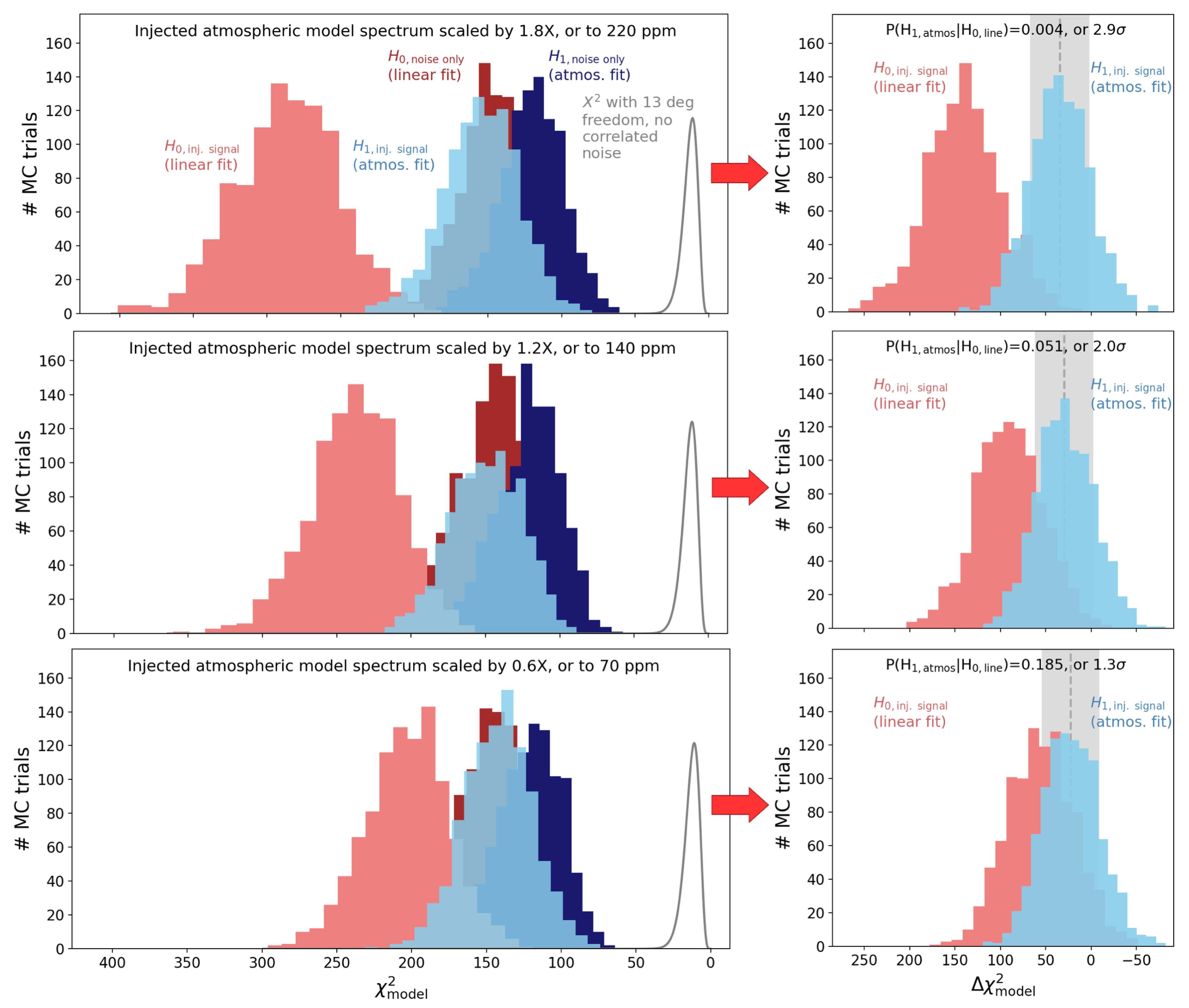Illustration of transmission spectrum injection and recovery testing procedure using measured χ2 (left panels) and Δχ2 (right panels) distributions. The J. Lustig-Yaeger et al. (2019) TRAPPIST-1b 10 bar CO2 atmospheric transmission spectrum is scaled by 0.6, 1.2, and 1.8 times and injected into the precorrection spectrum of all integrations. Bootstrapped χ2 values are recorded for linear and model atmosphere fits to the detrended mean flare spectrum under four scenarios: (i) a linear model fit to the spectrum with the injected signal; (ii) an atmosphere model fit to the spectrum with the injected signal; (iii) a linear model fit to the spectrum in the absence of any injected signals; and (iv) an atmospheric model fit to the spectrum in the absence of any injected signals. The presence of correlated noise in the no-atmosphere samples is highlighted by comparison to the random-variable χ2 function with the same 13 degrees of freedom. Hypothesis tests for atmosphere versus linear fits are therefore computed using Δχ2 distributions where the correlated noise baselines have been subtracted.