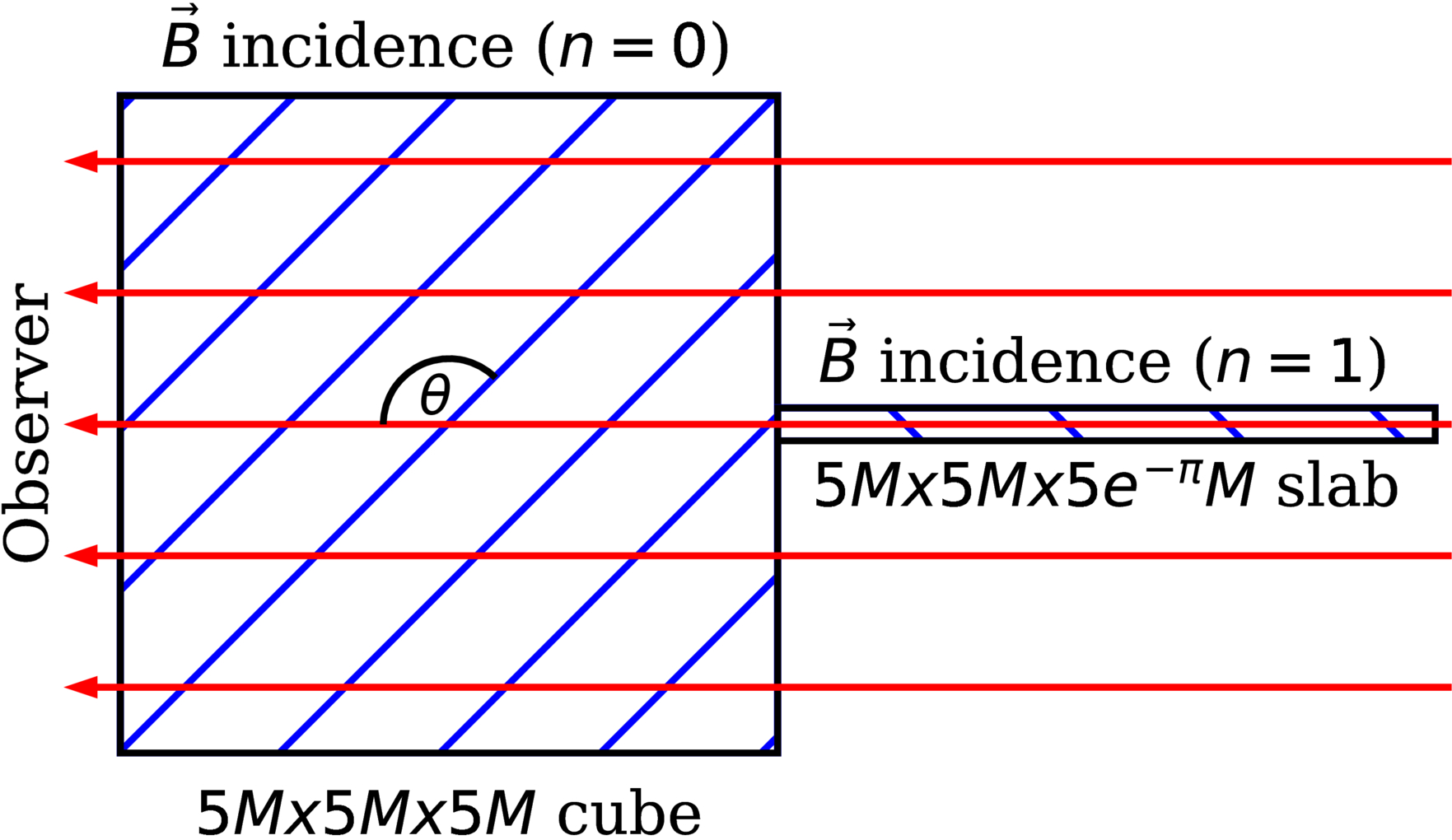 Cross section of the one-zone, two-angle model for the spectroscopy of the n = 0 and n = 1 images. Blue lines indicate field lines, while red rays show the optical path. The same uniform plasma occupies both cells, but the two cells make different angles of incidence with the rays, and the reduced on-sky area of the n = 1 image is represented by shrinking one dimension of the cube by e−π. In this example for a 5M cube emitter, the n = 0 magnetic field incidence angle is 135°, while the n = 1 is 45°; rays passing through the n = 1 region still experience radiative transfer through the n = 0 region. Both regions are assumed to be at rest.