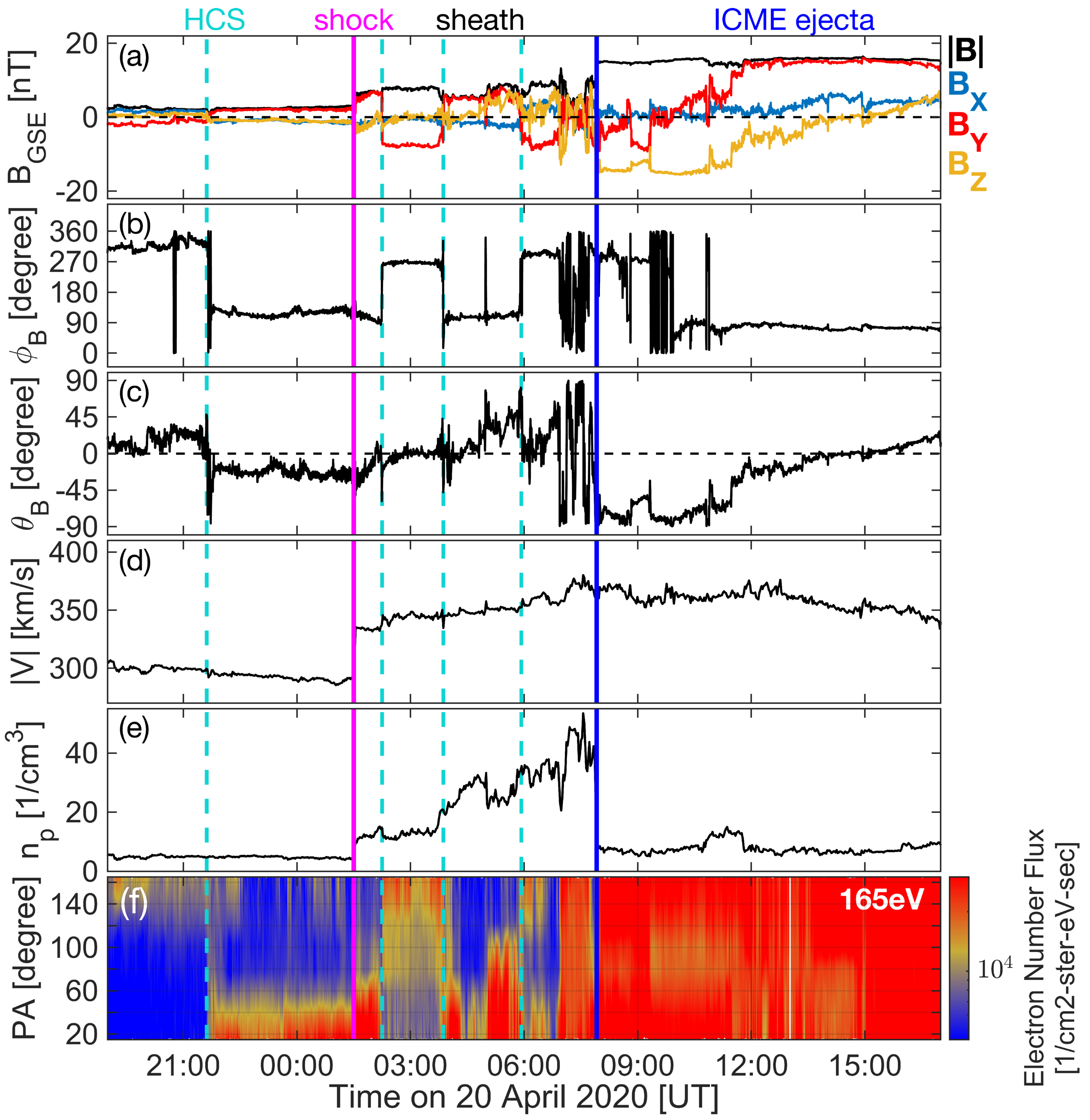 Wind spacecraft observations of an ICME ejecta and a preceding shock and sheath region at 1 au on 2020 April 20. Panel (a) shows the magnetic field (B) magnitude and Geocentric Solar Ecliptic (GSE) components of the field; panel (b) shows the magnetic field azimuthal (ϕB) component, and panel (c) shows the magnetic field latitudinal (θB) component with respect to the ecliptic plane; panel (d) shows the proton speed (∣V∣); panel (e) shows the proton density (np); and panel (f) shows the electron number flux at 165 eV energies for different pitch angles (PAs). The vertical lines indicate the shock (magenta), the ICME ejecta leading edge (blue), and the four HCS crossings (cyan).