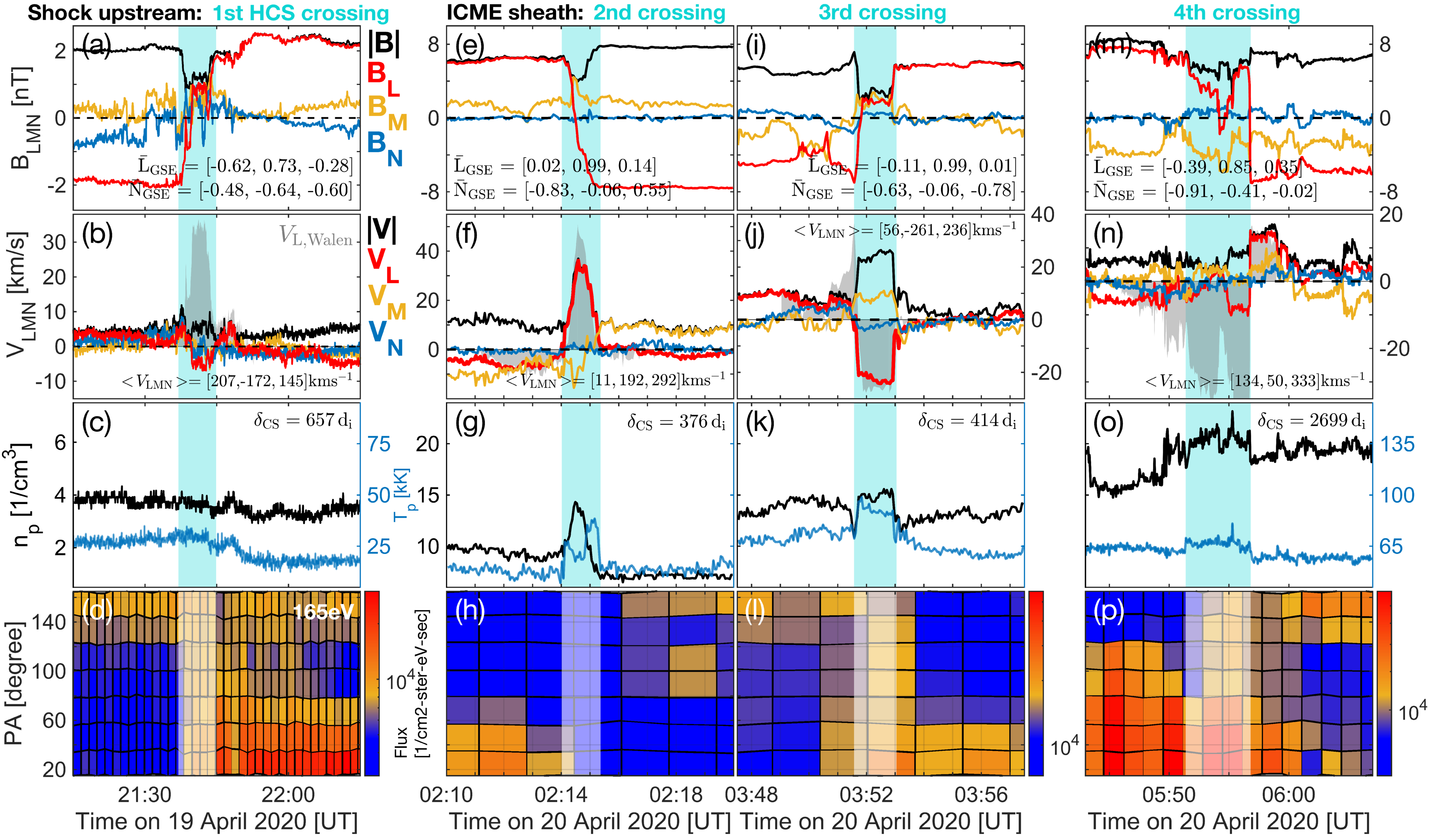 Wind magnetic field, plasma, and electron number flux observations across the four HCS crossings. First HCS crossing: panel (a) shows the magnetic field magnitude and the field components in LMN coordinates; panel (b) shows the proton velocity in the LMN coordinates with the mean velocity being subtracted; panel (c) shows the proton number density and temperature; and panel (d) shows the electron number flux at 165 eV energies for different pitch angles (PAs). Panels (e)–(p) show the corresponding parameters for the other three crossings. The L and N vectors of the local LMN coordinate system, average VLMN, and the current sheet widths (δCS) computed from VN and expressed in units of ion inertial length scale (di) are given. The cyan and white shading show the current sheet intervals. The gray shading shows the predicted VL based on the Walén relation.