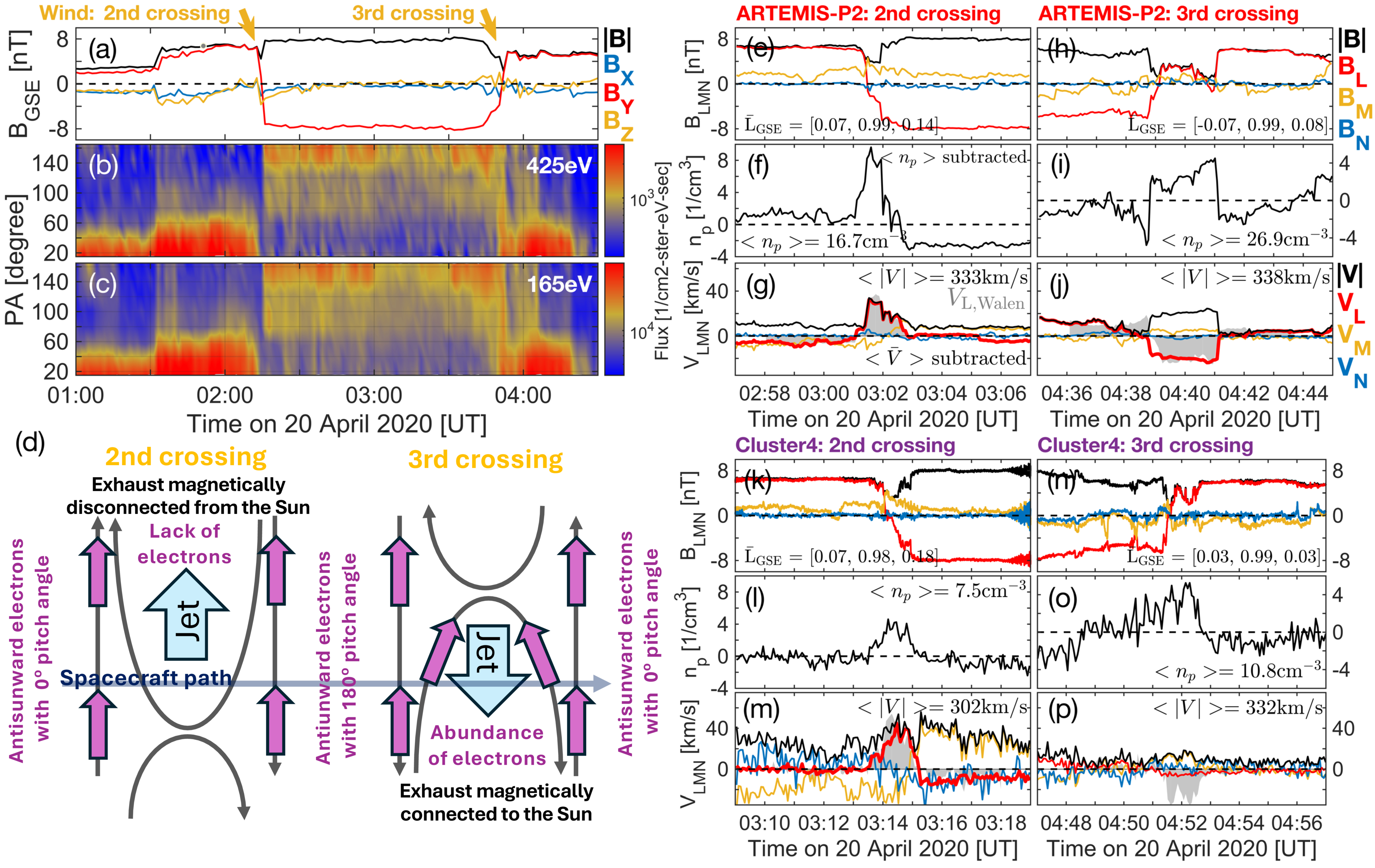 Multispacecraft observations across the reconnecting HCS crossings embedded in the ICME sheath (the second and third HCS crossings). Panel (a) shows the Wind magnetic field measurements across the crossings in GSE coordinates, and panels (b)–(c) show the electron number flux at different energies for different pitch angles (PAs). Panel (d) illustrates electron signatures observed within reconnection exhausts that are magnetically disconnected from Sun and magnetically connected to Sun. Panels (e)–(p) show magnetic field and plasma observations across the second and third HCS crossings from ARTEMIS-P2 and Cluster in a similar format to Figure 2.