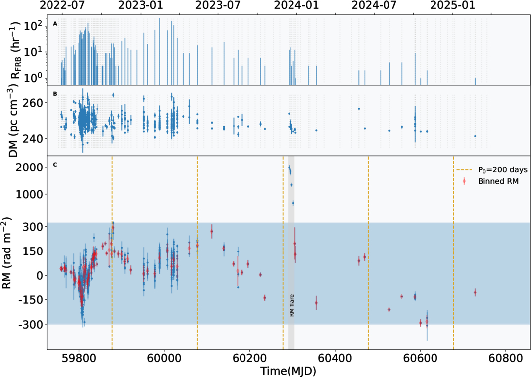 Temporal evolution of RM, DM, and burst rate in FRB 20220529. (A) FRB daily burst rate. Grey vertical dashed lines indicate observation days (bursts detected and undetected). The y-axis of the plot is logarithmic. (B) DM of bursts. The blue points represent the detected DM values with their uncertainties. (C) RM of bursts. The filled blue region delineates the RM variation range excluding the RM flare epoch, with the y-axis range scaled to compress the RM flare region and enhance the visibility of the primary dataset. The red points correspond to the daily-binned RM values. The orange lines mark the phases corresponding to the peak of the 200 day period, approximately at phase 0.25.