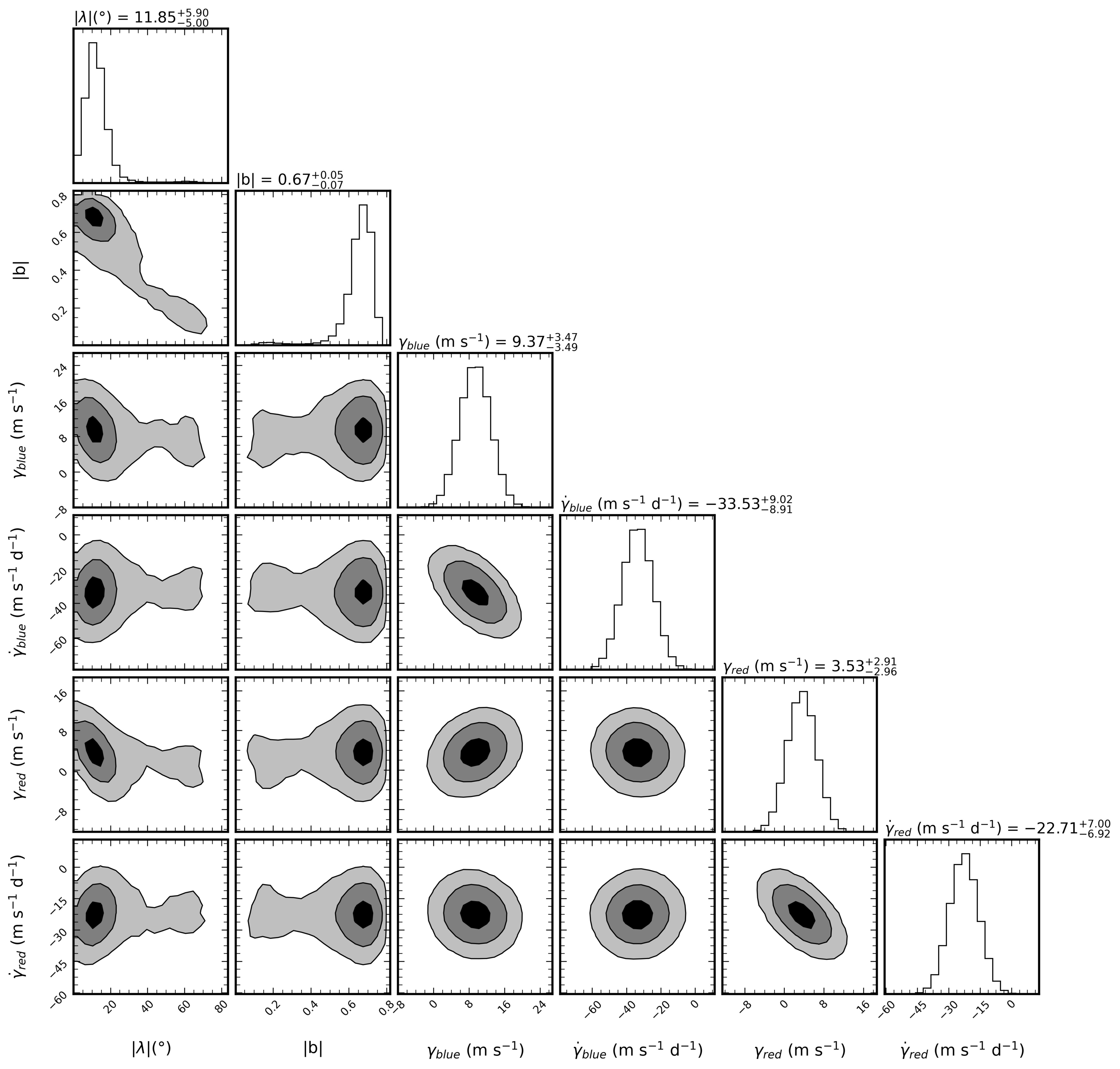 Corner plot of a subset of the RM parameters. The contours show the 1, 2, and 3σ levels. Only 99% of the distribution is shown for clarity. The sky-projected obliquity angle (λ) is correlated with the impact parameter (b) but seems to be minimally impacted by the the RV trend line parameters (γ and ﹩\dot{\gamma }﹩), with the exemption of the largest λ values (with a near-flat RM signal near egress) corresponding to a tighter RV trend line solution. Remaining, unshown parameters are similarly Gaussian distributed with little correlation between parameters.