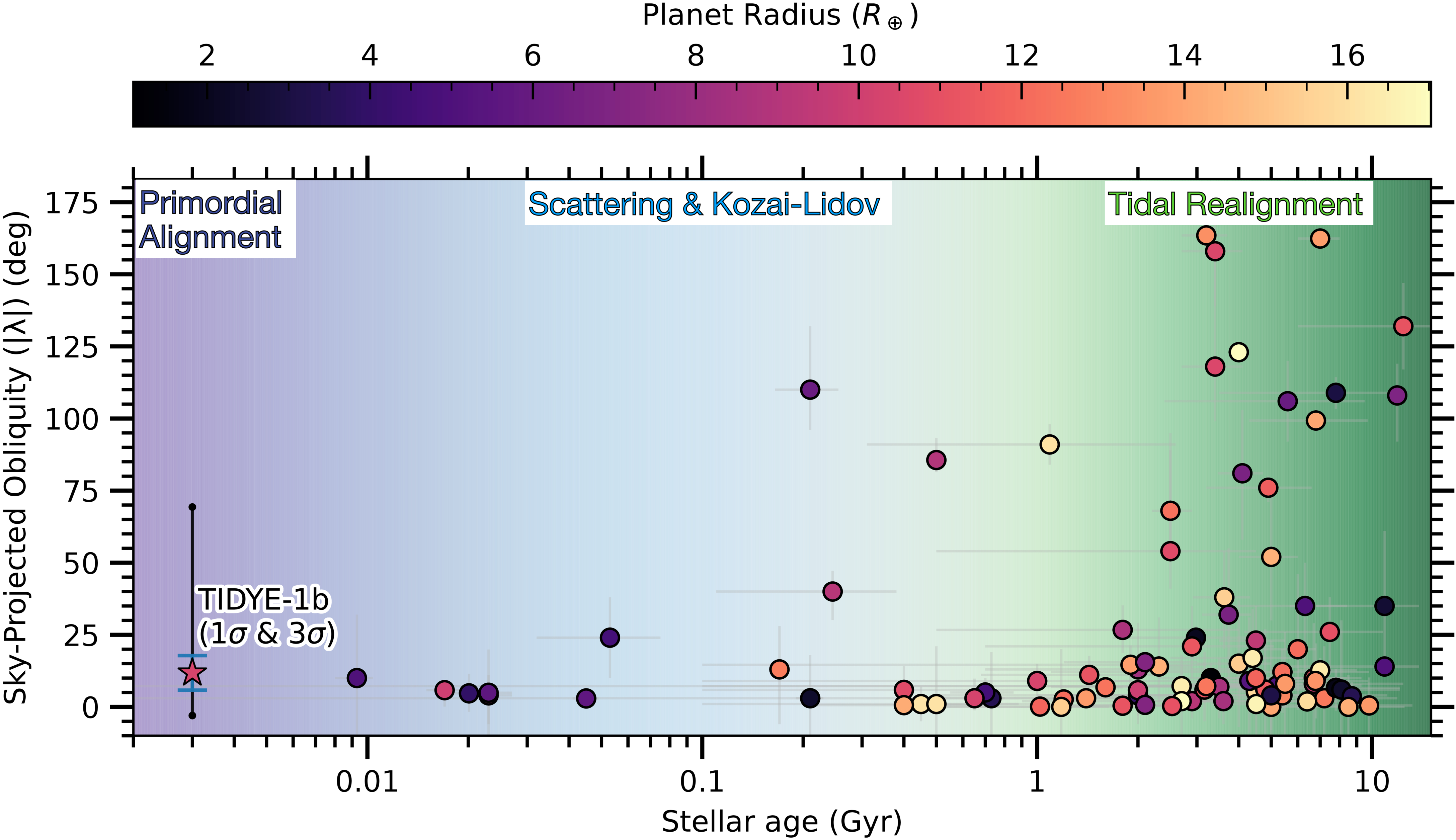 Distribution of sky-projected obliquity angles (∣λ∣) for transiting planets across system ages (J. Southworth 2011; https://www.astro.keele.ac.uk/jkt/tepcat/obliquity.html). This only considers planets with masses below 10 MJ (or no measured mass), Teff < 6250 K, σλ < 25°, and those with literature ages (taken from the NASA Exoplanet archive; J. L. Christiansen et al. 2025). All points are colored by the planet radius. Young systems tend to be aligned but the difference is not significant. TIDYE-1 b (IRAS 04125+2902b; star) is consistent with the few other <0.1 Gyr systems. The background shading represents rough approximations of the timescales for processes of interest for the SOYSAUCE survey.