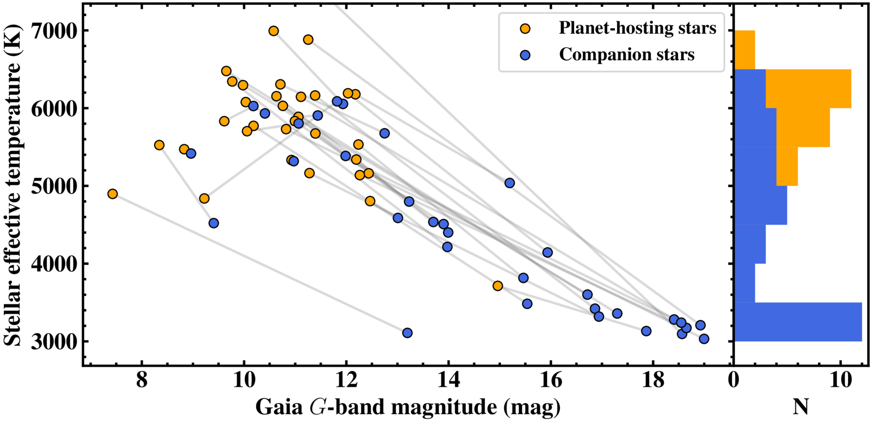 Stellar effective temperature (Teff) and Gaia DR3 G magnitude for the stellar-obliquity sample with stellar companions. Planet host stars and their corresponding stellar companions are shown as orange and blue dots, respectively. The gray lines connect each host–companion pair. The Teff distributions of the two populations are shown in the right panel. Interestingly, in our stellar-obliquity sample (consisting of hot Jupiters), the planet host is always the more massive component of a binary.