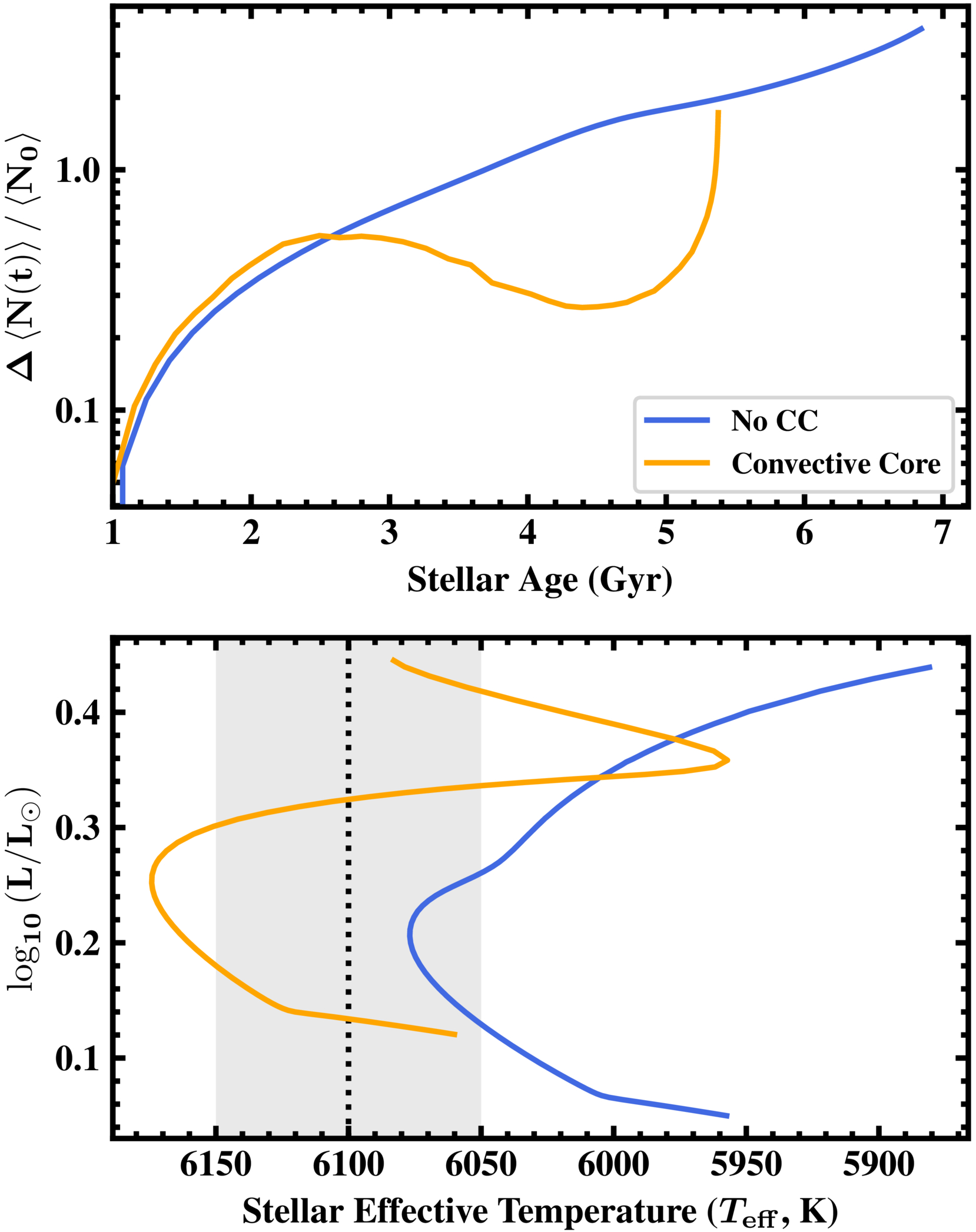 Evolution of solar-composition MESA stellar models on either side of the convective-core transition. In both panels, the blue curves show the time evolution of 1.11 M⊙ stellar models, which do not exhibit a long-lived convective core on the main sequence, while the orange curves show those of 1.15 M⊙ stellar models, where a convective core persists throughout the main sequence until core hydrogen exhaustion. The upper panel shows the time evolution of the average Brunt–Väisälä frequency (or, equivalently, the g-mode undertone spacing), Equation (1), compared to a reference epoch of t0 = 1 Gyr, as in J. J. Zanazzi et al. (2024). The lower panel shows how these stellar models evolve on the Hertzsprung–Russell diagram.