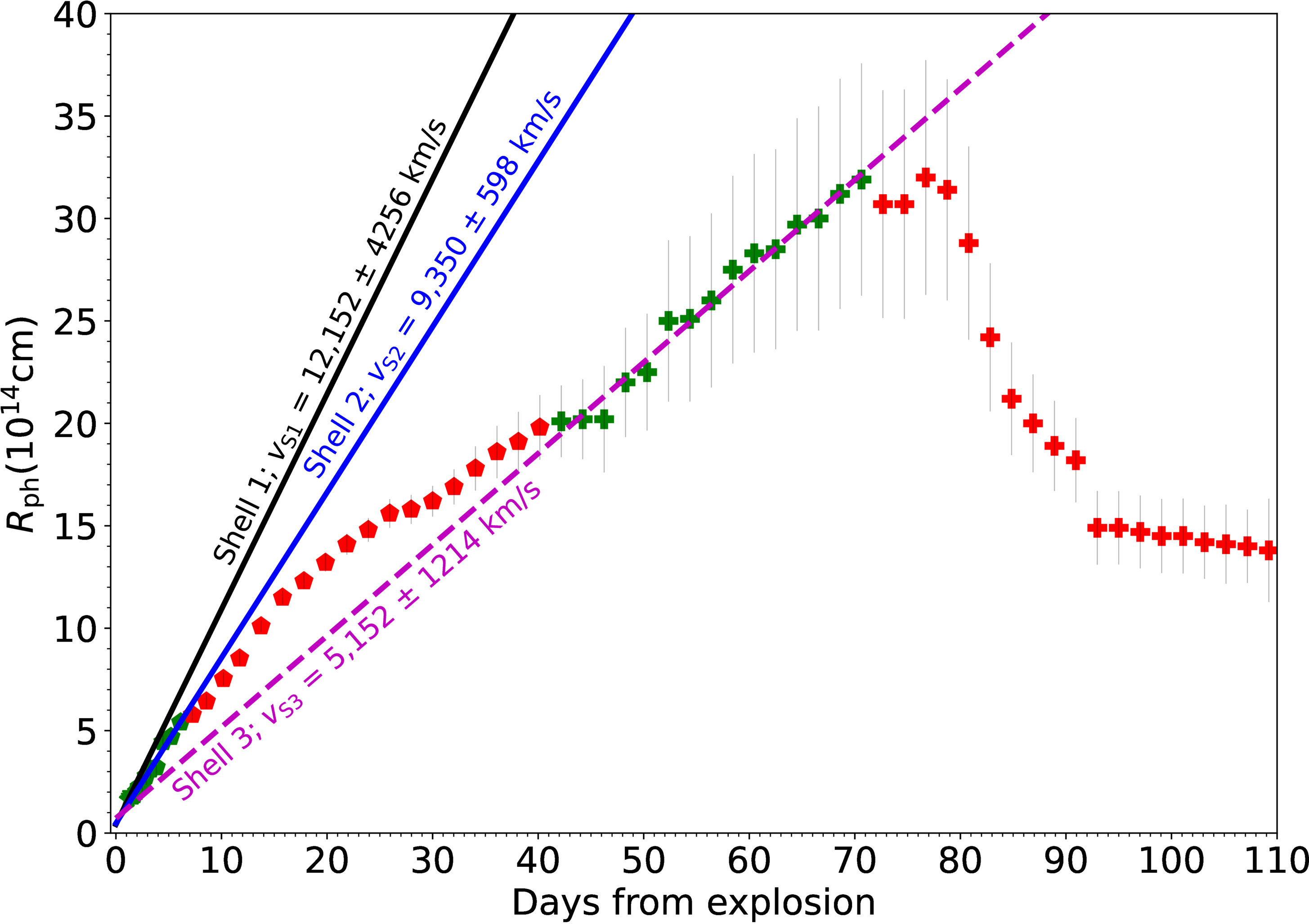 Similar to Figure 1, but including later times and different scales on the axes. As in Figure 1, red pentagons and pluses are excluded from fittings. We fit a third straight line to the points in the time period of t = 42.19–70.63 days (green pluses); this is Shell 3. The points from day 7 to day 41 (red pentagons) are the photospheric radius in the ejecta inward to Shell 2 and outside Shell 3. During that time, the photosphere moves inward in the mass coordinate of the ejecta. Therefore, each point corresponds to a deeper mass layer than the previous point; the points do not represent a single layer. For that, we cannot fit a straight line through these points. Around day 45, the front of Shell 3 becomes the photosphere. From there to about day 71, a straight line corresponds to the front of Shell 3. After day 71, Shell 3 became transparent, and the photosphere moved inward in the mass coordinate of the ejecta (red pluses).