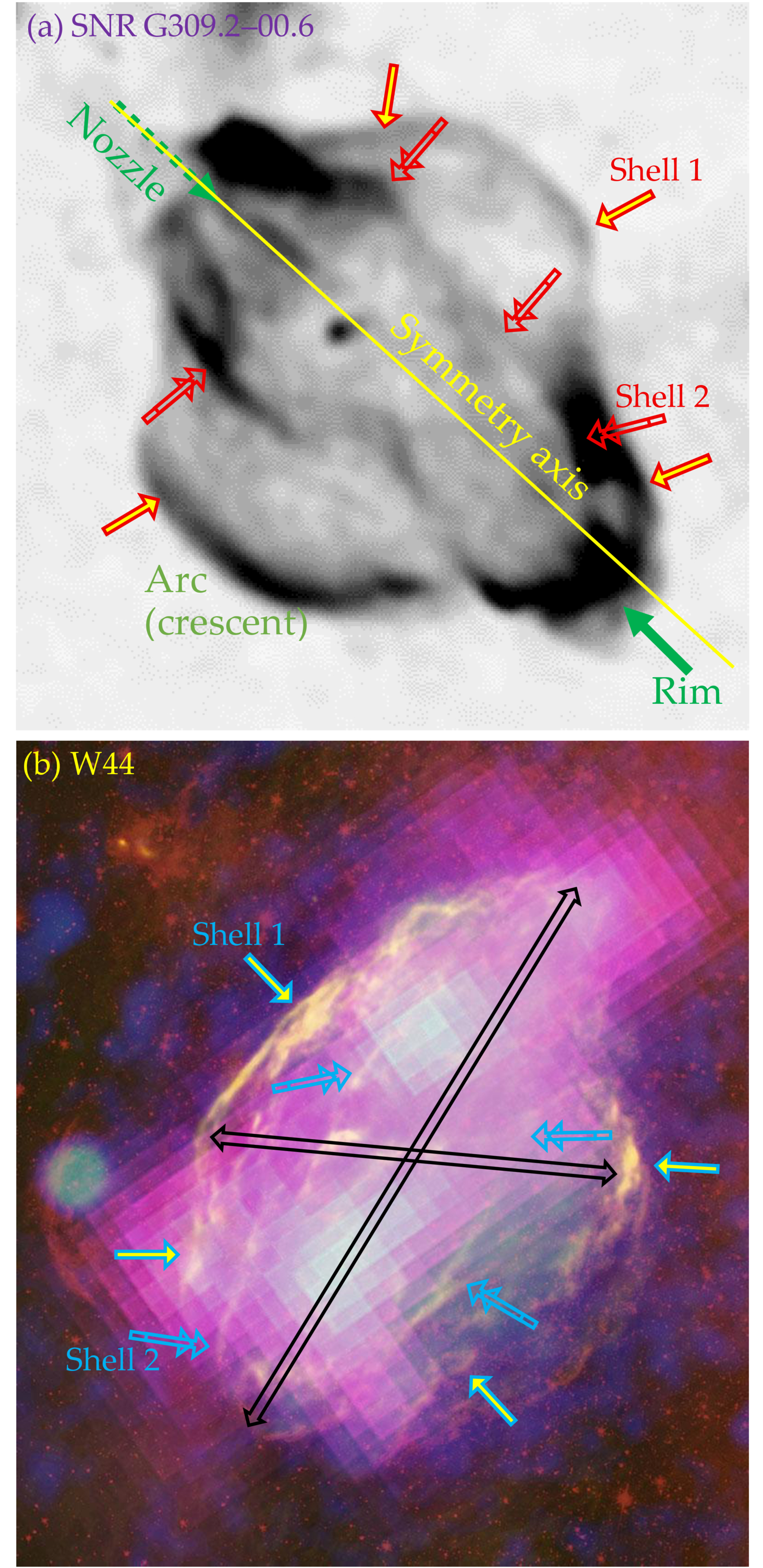 Two images of CCSN remnants with two full (or almost full) shells (but not spherical). Studies attributed their morphologies to the JJEM. In each image, we marked the two prominent shells that can form two photospheric shells one after the other during the photospheric phase of such CCSNe; the arrows point to only four points on the projection of each shell boundary onto the plane of the sky. Filled double-lined arrows point at the first shell, and the empty double-lined double-headed arrows point at the second shell. (a) A radio image of SNR G309.2-00.6 adapted from B. M. Gaensler et al. (1998), who already argued that jets shaped this CCSN. The rim-nozzle symmetry marks are from N. Soker (2024b). (b) A composite image of CCSNR W44 from a NASA site (www.nasa.gov/universe/nasas-fermi-proves-supernova-remnants-produce-cosmic-rays/). N. Soker (2024c) added the two double-headed arrows that depict the two axes of the two energetic pairs of jets that participated in the explosion of W44. Magenta: GeV gamma-ray from Fermi’s Large Area Telescope (LAT); yellow: radio from the Karl G. Jansky Very Large Array; red: infrared; blue: X-ray from ROSAT. Credit: NASA/Department of Energy/Fermi LAT Collaboration, NRAO/Associated Universities Inc., JPL-Caltech, and ROSAT.