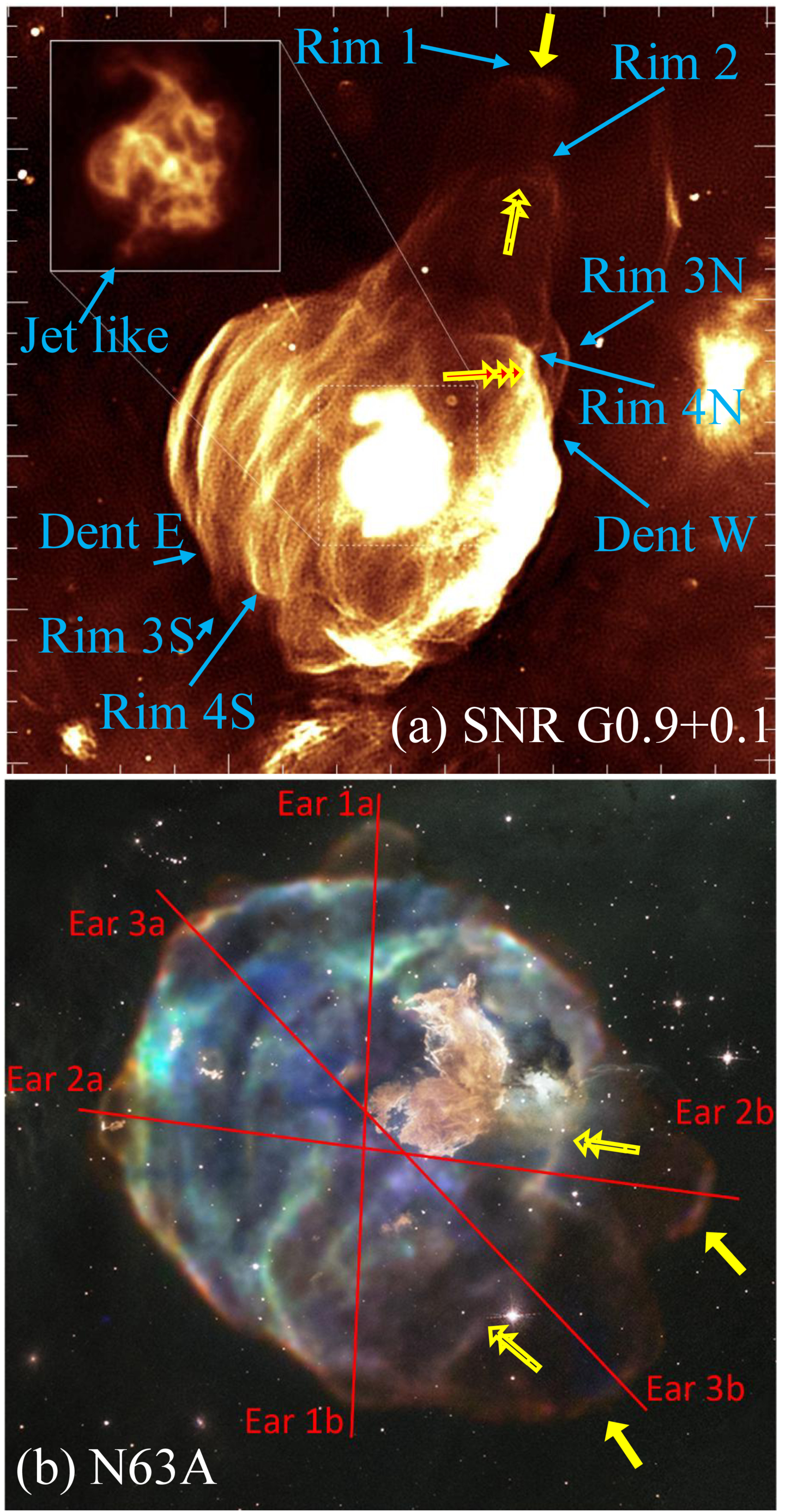 Two images of CCSNRs where at least one shell is partial. (a) A MeerKat radio image at 1.28 GHz of SNR G0.9+0.1 adapted from I. Heywood et al. (2022). The inset on the upper left is a desaturated image of the pulsar wind nebula. N. Soker (2025a) added the pale-blue marks of structural features used to identify the point-symmetric morphology. For a line of sight along the large ear in the north, the three shells (their projection on the plane of the sky forms the rims) might form three photospheric shells. The first two (pointed at by the solid one-head yellow arrow and double-lined double-headed yellow arrow) are partial. The third shell (pointed at by the three-headed arrow) is the main shell of the supernova remnant. (b) A Chandra X-ray image of N63A (red, green, and blue for different X-ray energy bands); see also E. Karagöz et al. (2023). N. Soker (2024d) added the three red lines between the tips of opposite ears to mark the symmetry axis of three pairs of jets that participated in the explosion of this point-symmetric CCSNR. Each ear’s front can form the first photospheric shell, depending on the viewing angle. The main CCSNR forms the next photospheric radius. The light brown region to the upper right of the three red lines is optical light detected by Hubble. (Credit: enhanced Image by Judy Schmidt based on images provided courtesy of NASA/Chandra X-ray Observatory/Smithsonian Astrophysical Observatory and NASA/STScI.)
