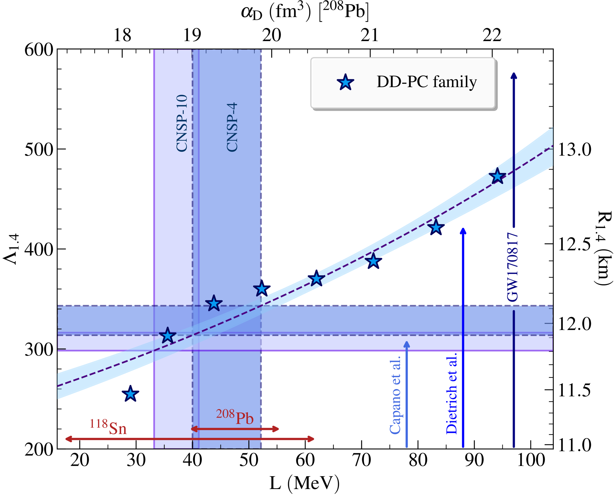 The dimensionless tidal deformability of a 1.4 M⊙ neutron star Λ1.4 (left axis) and its corresponding radius R1.4 (right axis) as a function of the slope of the symmetry energy L for DD–PC EOSs. The dipole polarizability of 208Pb is also shown on the top axis for reference. The vertical shaded regions represent the L values obtained from dipole polarizability for the CNSP-4 and CNSP-10 sets of nuclei, while the horizontal shaded regions denote the corresponding constraints for the Λ1.4(or R1.4), respectively. Vertical arrows indicate neutron star radii from C. D. Capano et al. (2020), T. Dietrich et al. (2020), and Λ1.4 from the GW170817 event (B. P. Abbott et al. 2019). Horizontal arrows mark nuclei with the largest and smallest deviations of L value.