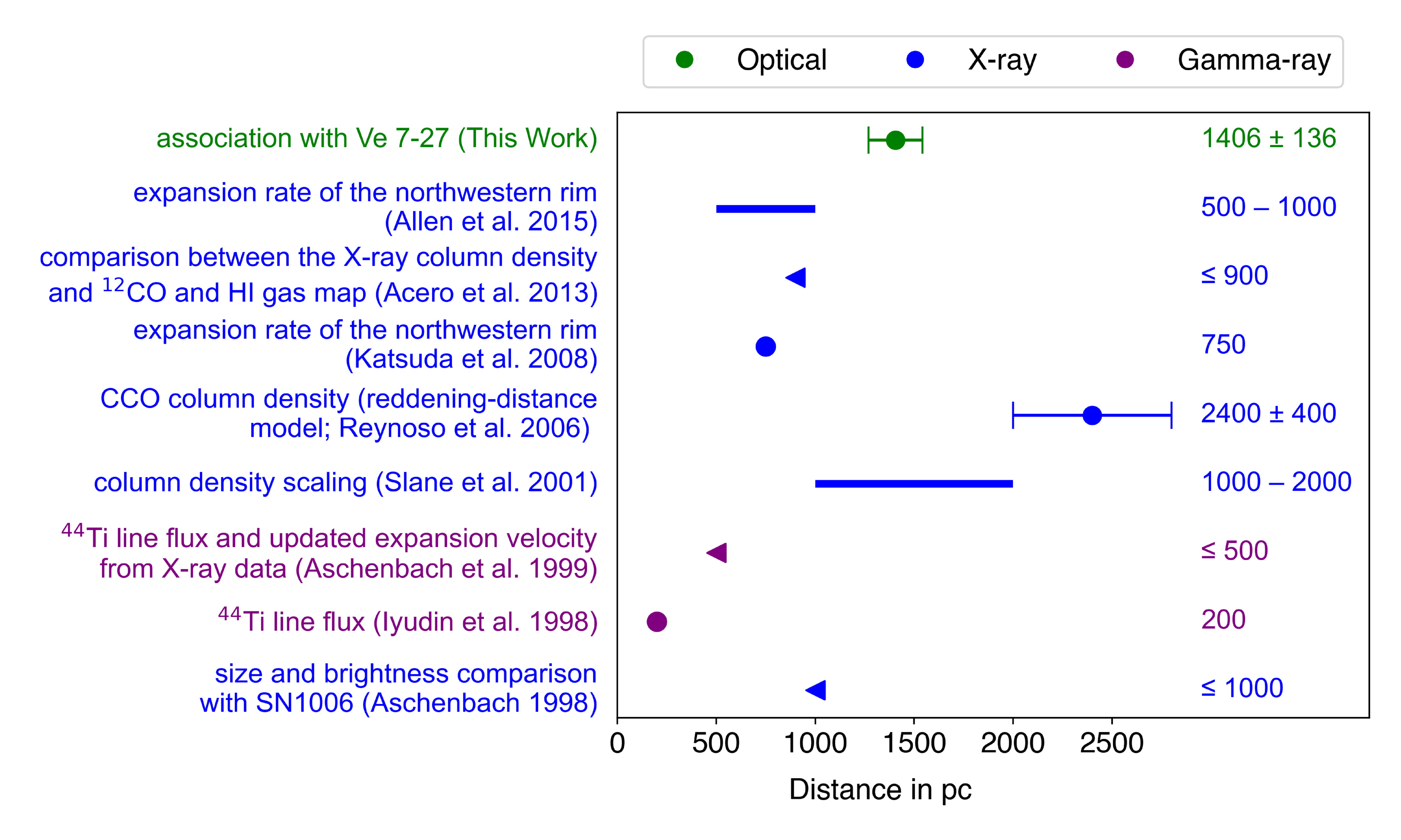 Distance estimates to Vela Jr from the literature (see Appendix A) and this work, arranged in reverse chronological order. The y-axis lists the methods used, and the colors indicate the wavelength regime of the observations used in the estimate: green for optical, blue for X-ray, and purple for γ-ray.