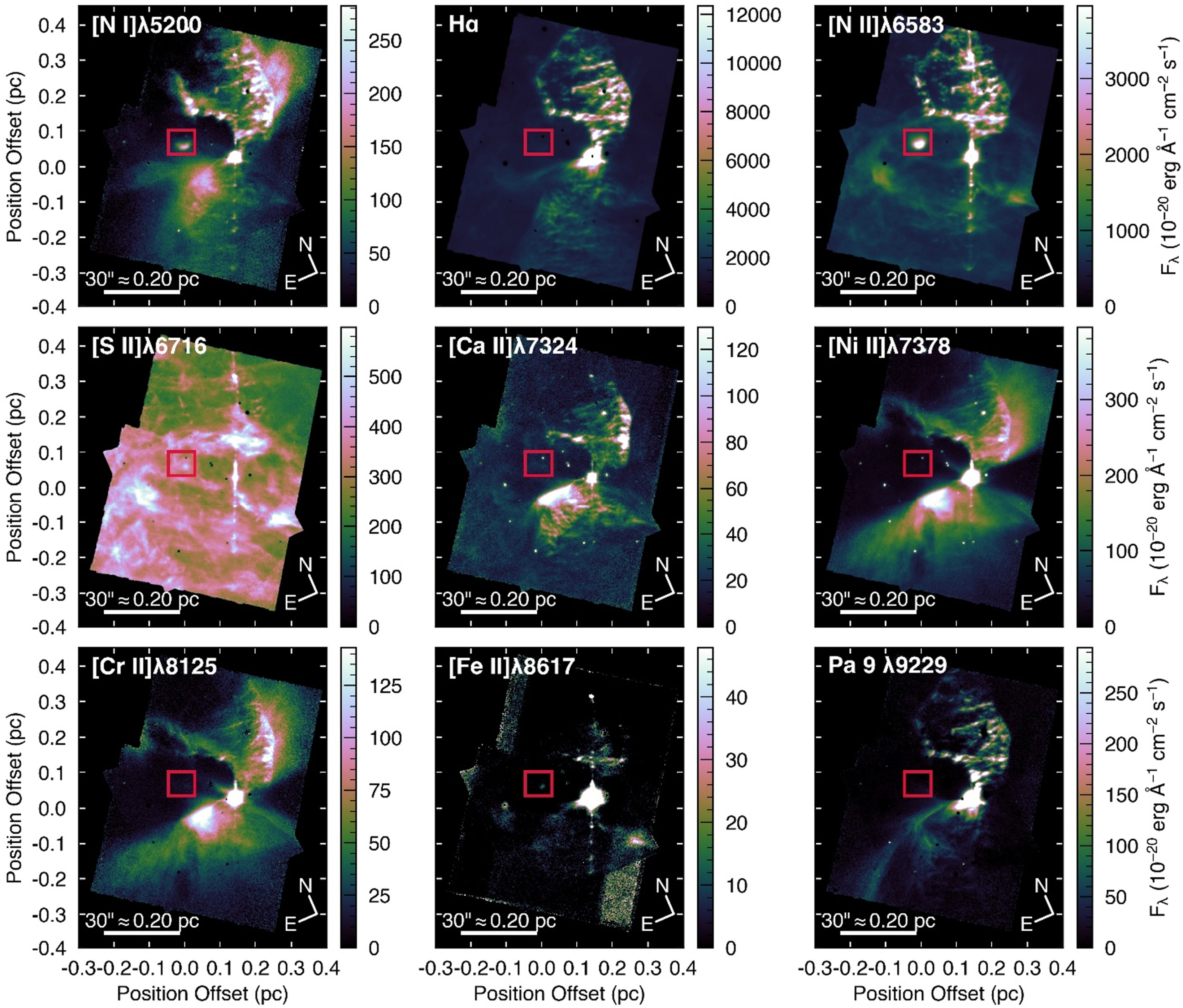 Continuum-subtracted MUSE narrowband images constructed by integrating each line over the velocity range −150 to +200 km s−1. Top row: [N I]λ5200, Hα, and [N II]λ6583 line emissions. Middle row: [S II]λ6716, [Ca II]λ7324, and [Ni II]λ7378. Bottom row [Cr II]λ8125, [Fe II]λ8617, and Pa 9 λ9229. The red square in each panel marks the position of Vela Jr CCO nebula.