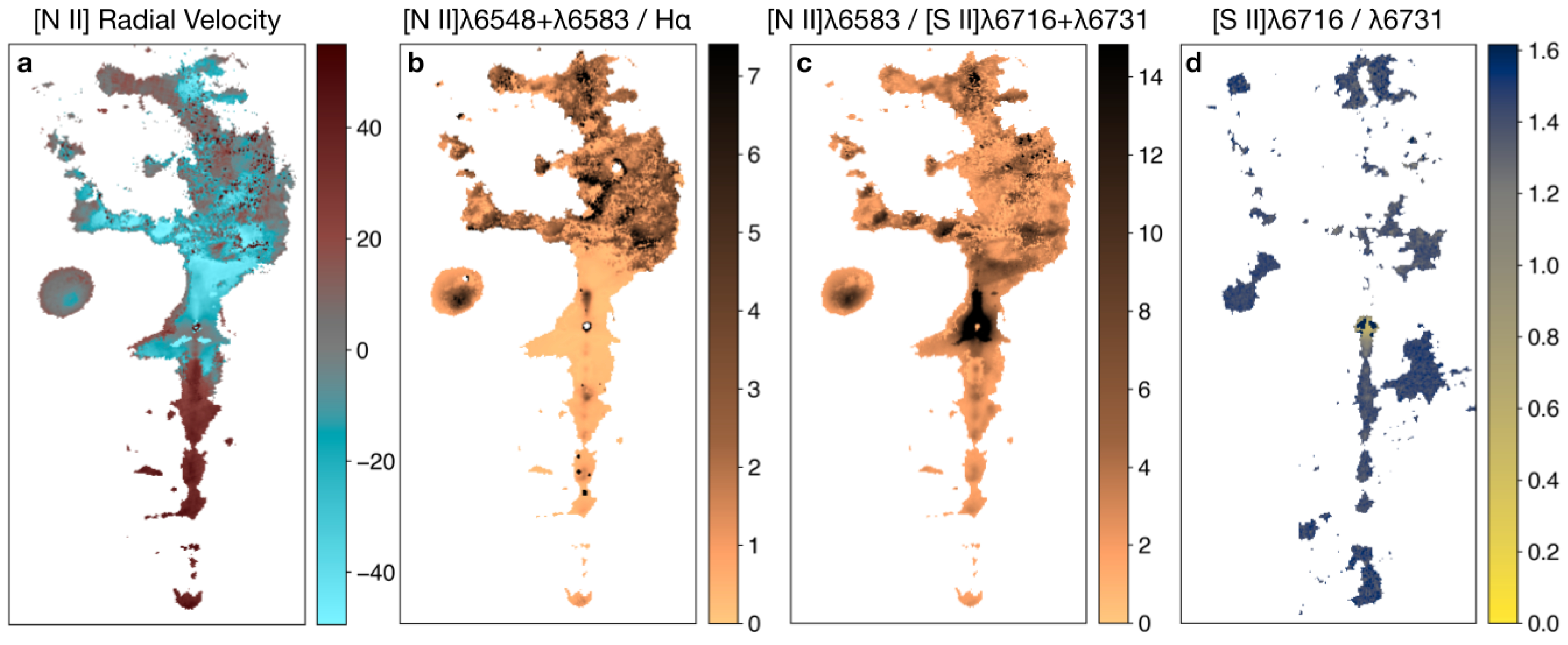 (a) Velocity map of the [N II]λ6583 line, showing the kinematic structure of Ve 7–27 and Vela Jr CCO nebula. (b) Spatial distribution of [N II]/Hα ratio and (c) [N II]/[S II], both highlighting the strong nitrogen enrichment of both Ve 7–27 and the CCO nebula. (d) Spatial map of the canonical electron-density-sensitive [S II]λ6716/λ6731 ratio across the field. This ratio decreases with increasing electron density.