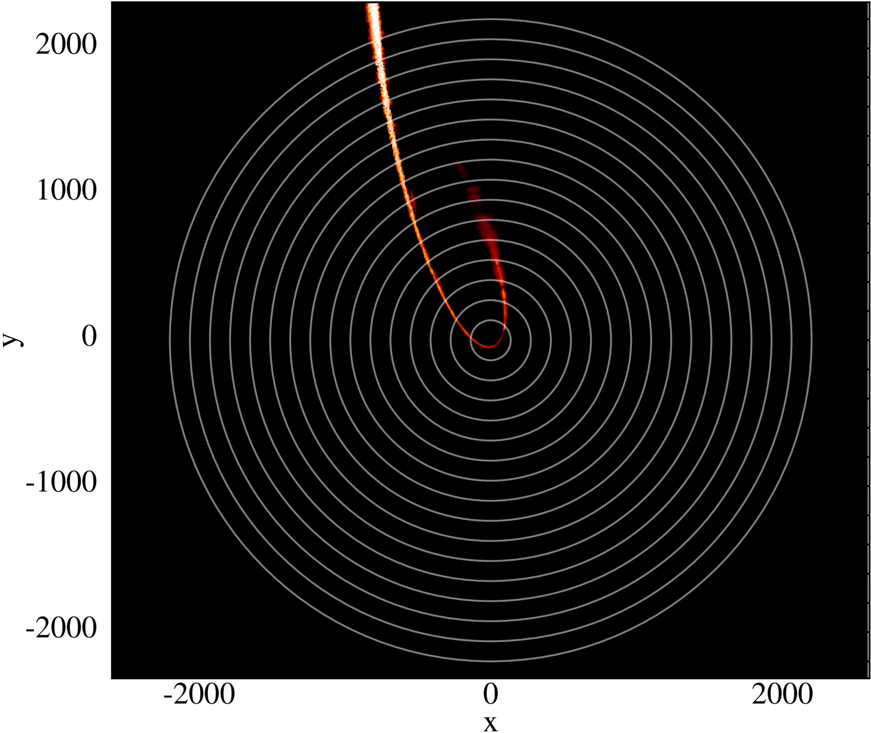 Demonstration of the APR boundaries used (16 levels in the figure). The spherical boundaries are centered on the MBH. The outermost boundary is at r = 2200Rg ≈ 3.25 × 1014 cm with Δr = 137.5Rg ≈ 2.03 × 1013 cm between each boundary, where Rg = Rs/2 = GM/c2 is the gravitational radius of the MBH. r = 2200Rg is the same in all simulations, whereas Δr = 1100, 550, 275, and 183.3 for 2-, 4-, 8-, and 12-level simulations, respectively.