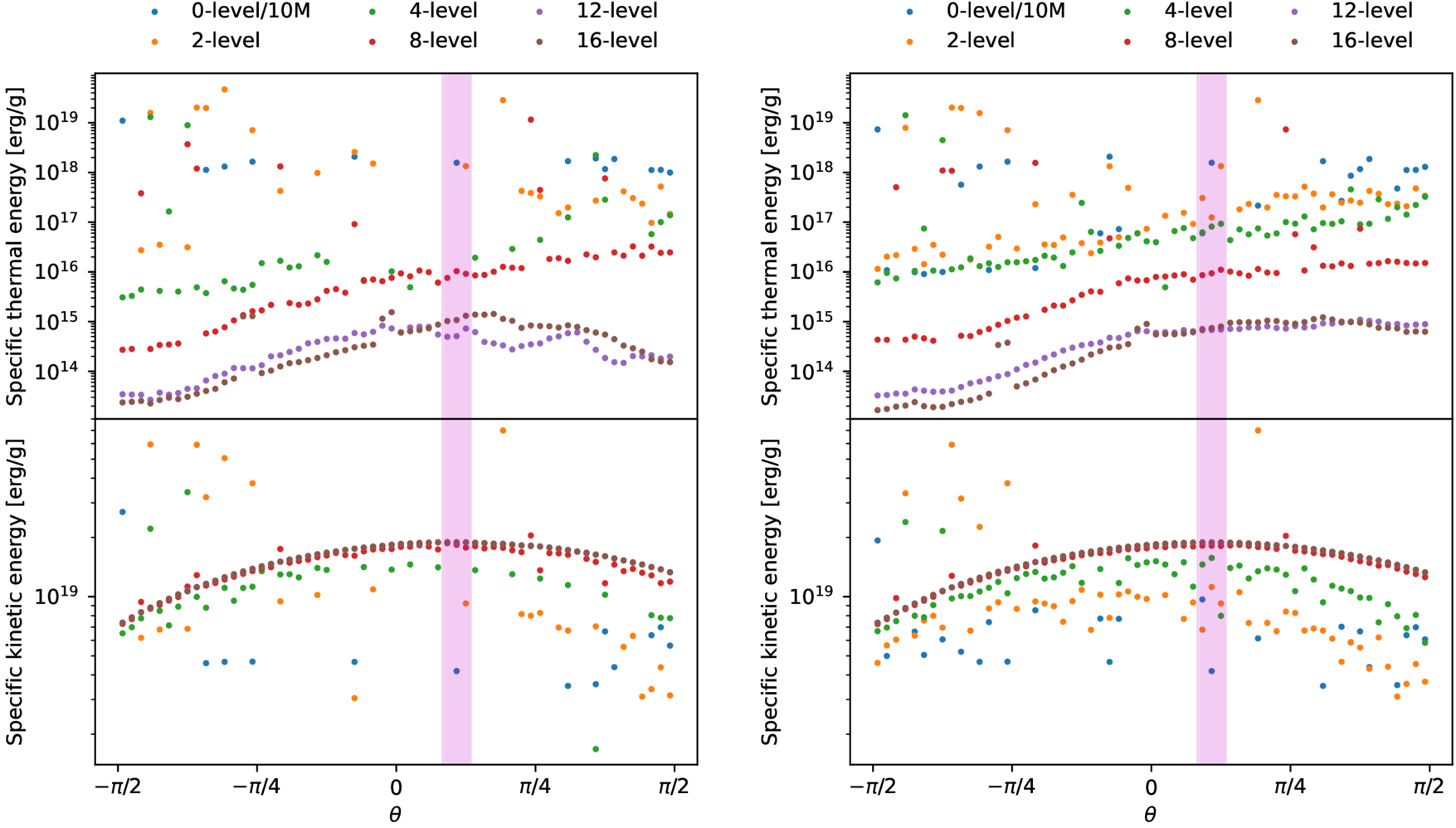 Measuring the specific thermal and kinetic energies as a function of angular coordinate θ relative to the MBH as the leading edge of the tidal stream passes through pericenter. The pink region represents the estimated pericenter used in Section 3.2.1. Left: one snapshot with very few particles for the 0-, 2-, and 4-level simulations. Particles are only present in 13, 26, and 33 beams, respectively, of the 60 beams plotted. Right: the average of four adjacent snapshots, showing enough particles to meaningfully analyze in the lower-resolution simulations, with 25, 56, and 59 beams occupied for 0-, 2-, and 4-level simulations, respectively. Data are available on Zenodo at doi:10.5281/zenodo.17225834.