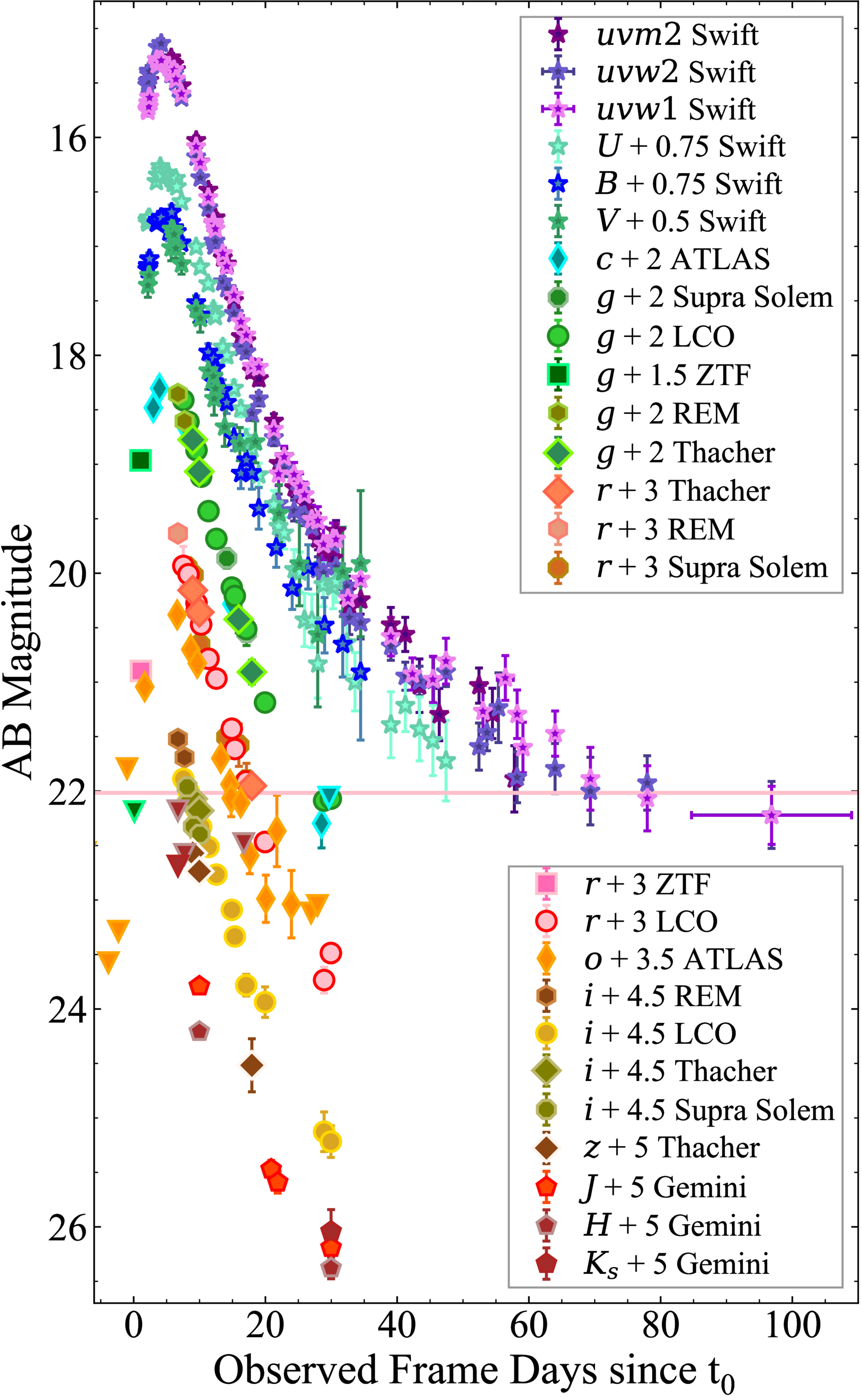 UVOIR light curve of AT 2024wpp corrected for Galactic extinction. Offsets are applied for clarity. Pink horizontal line: pre-transient GALEX NUV emission at the location of the transient, marking the level of UV emission from the host galaxy. At ≳80 days, the Swift UV photometry is dominated by the host galaxy flux. In Section 2.1, we use the GALEX NUV observation to subtract the host galaxy contribution from the Swift m2 photometry. Magnitudes are expressed in the AB system (J. B. Oke & J. E. Gunn 1983).