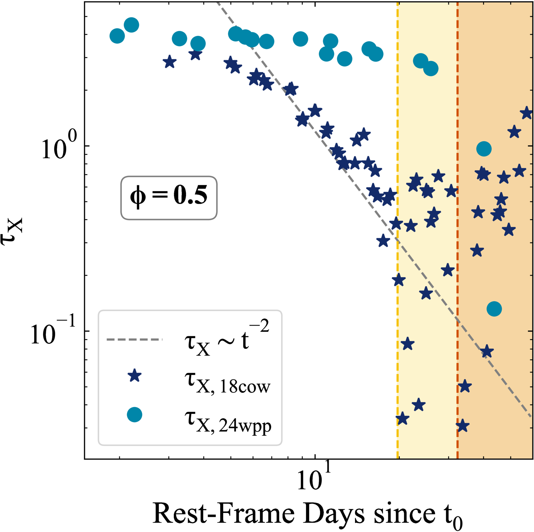 Assuming that the observed LUVOIR is purely due to radiative processing of X-rays (B. D. Metzger 2022a) occurring within (an arbitrary) 50% of the solid angle (parameterized by ϕ; in the other half, we assume that all X-rays are reprocessed), we calculate the associated τX for AT 2024wpp (circles) and AT 2018cow (stars) over time and compare to the time of emergence of spectral features (vertical dashed lines; same as Figure 9) for each object. The gray dashed line represents the canonical scaling (τX ∝ t−2) for radiation escaping a medium expanding at constant velocity. We find that AT 2024wpp maintains a higher τX for longer compared to AT 2018cow. This is consistent with the features of AT 2024wpp emerging at a later epoch and with the larger inferred Mej (Section 3).