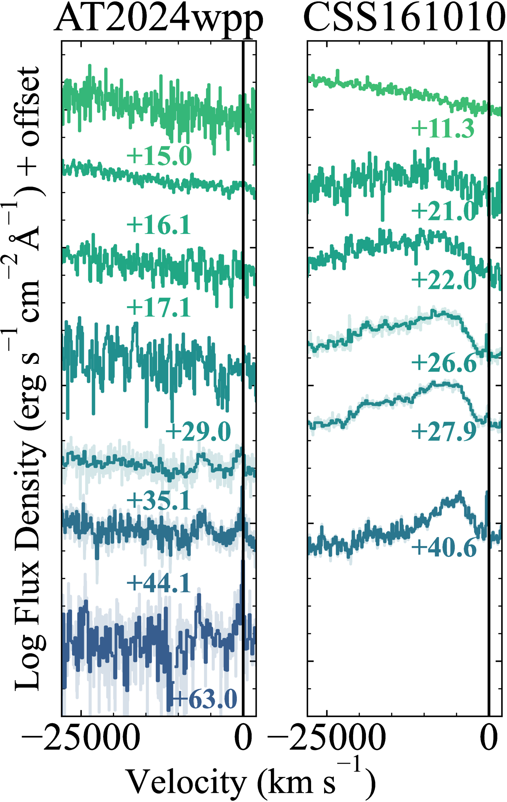 Evolution of the Hα line in AT 2024wpp (left) and CSS161010 (right; C. P. Gutiérrez et al. 2024), the two LFBOTs with evidence for blueshifted emission. The v = 0 km s−1 component in CSS161010’s spectrum is narrow host galaxy emission. In AT 2024wpp, the component is broader (FWHM ≈ 2000 km s−1, similar to the blueshifted component; see Figure 11); thus, we identify it as a transient emission feature. The lightly shaded spectra indicate native binning.