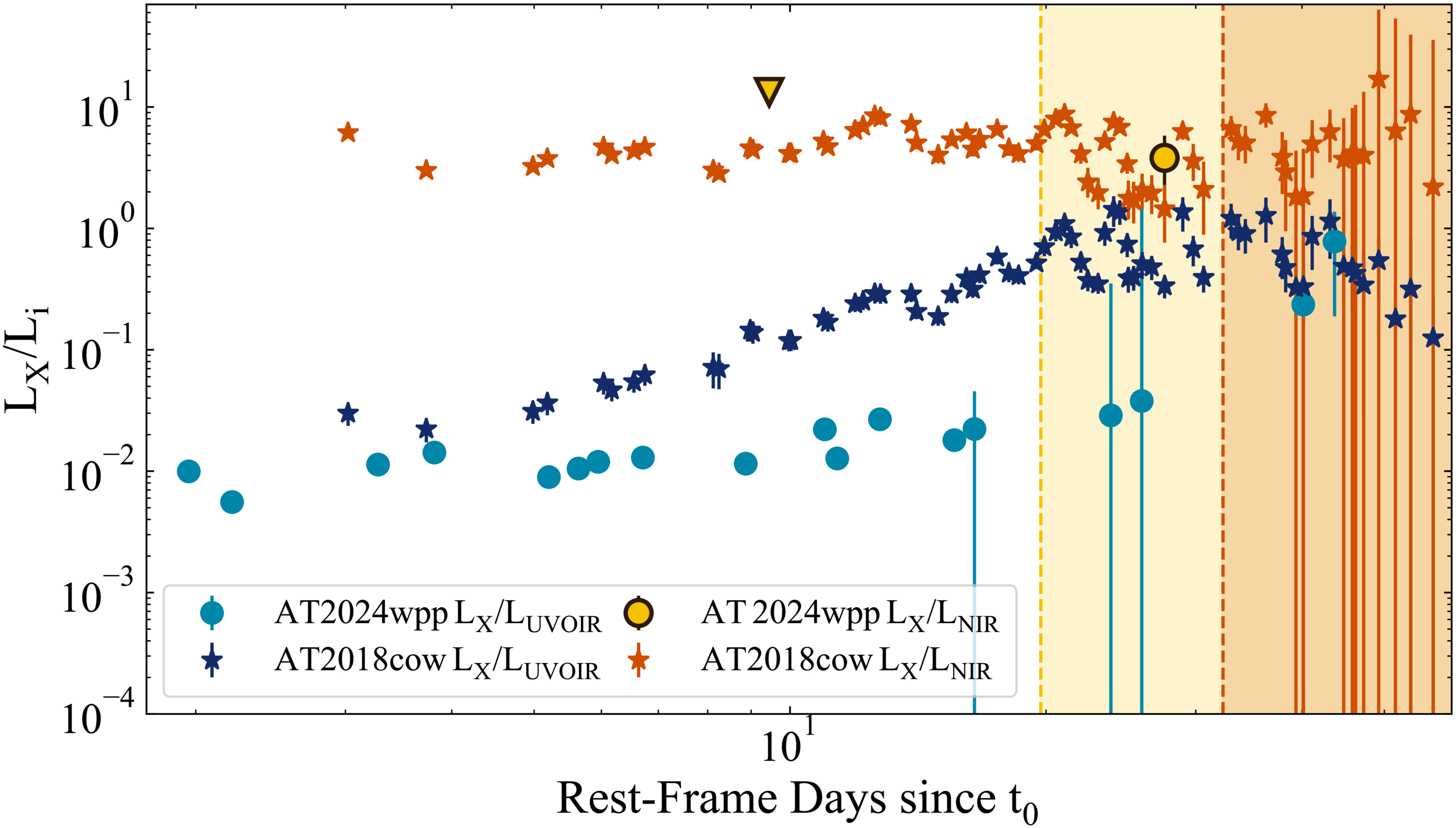 Ratio of the soft (0.3–10 keV) X-ray luminosity (LX) to LUVOIR (shades of orange) and LNIR (shades of blue; see Section 6) for AT 2024wpp (circles) and AT 2018cow (stars). LUVOIR is calculated from the blackbody fits (see Figure 5). The shaded yellow (orange) area marks the time of emergence of clear spectral features with widths of a few × 103 km s–1 in AT 2018cow (AT 2024wpp). Interestingly, for both events this happens for LX ≈ LUVOIR. This plot also shows that LX/LNIR ≈ constant with time for AT 2018cow and that the parameters of AT 2024wpp are consistent with the same value. AT 2018cow data from R. Margutti et al. (2019); AT 2024wpp LX data from Paper II.
