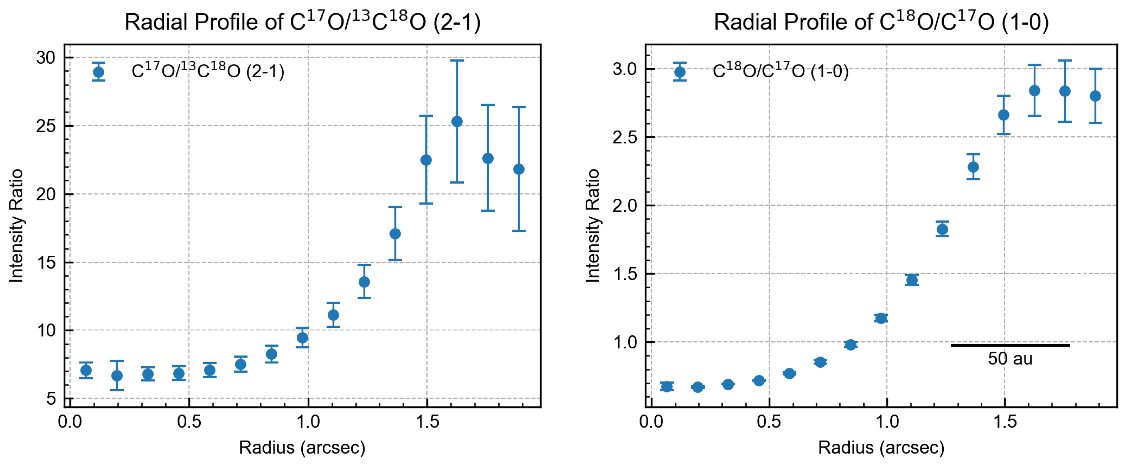 Radial profiles of the same-transition isotopologue intensity ratios. Left: C17O/13C18O(2–1) ratio, flat at small radii, rising steeply across the CO snowline, and converging to ∼20 beyond 1﹩\mathop{.}\limits^{^{\prime\prime} }﹩5. Uncertainties include both statistical errors and a 7.1% systematic calibration term, as the two lines were observed in different bands and epochs. Right: C18O/C17O(1–0) ratio, showing similar radial behavior and approaching ∼2.7 beyond 1﹩\mathop{.}\limits^{^{\prime\prime} }﹩5. Only statistical uncertainties are shown, since both lines were observed in the same band and share a common amplitude calibration. In both panels, the rapid increase followed by a flat plateau indicates the sharp decline in CO column density across the snowline and identifies the outer disk as an optically thin region suitable for isotopic ratio analysis.