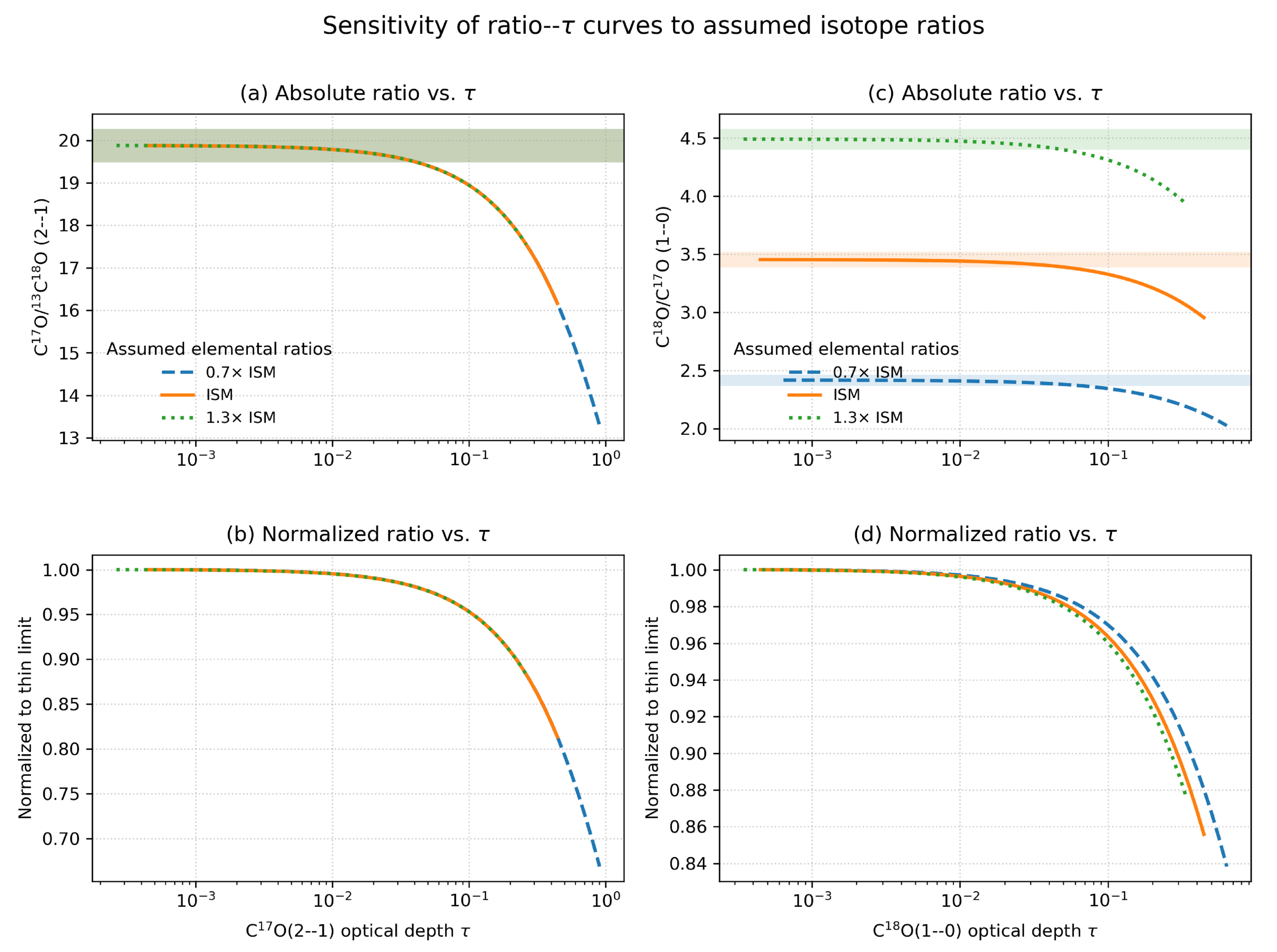 Test B: sensitivity of the ratio-τ relation to coherent scaling of all isotopic ratios by ±30% around the ISM values. Top panels: absolute C17O/13C18O(2–1) (left) and C18O/C17O(1–0) (right) ratios as a function of line-center optical depth. Bottom panels: normalized curves collapse to within ≲1%–2% for τ ≲ 0.3, confirming the robustness of our optical depth diagnostic and thin-region identification.