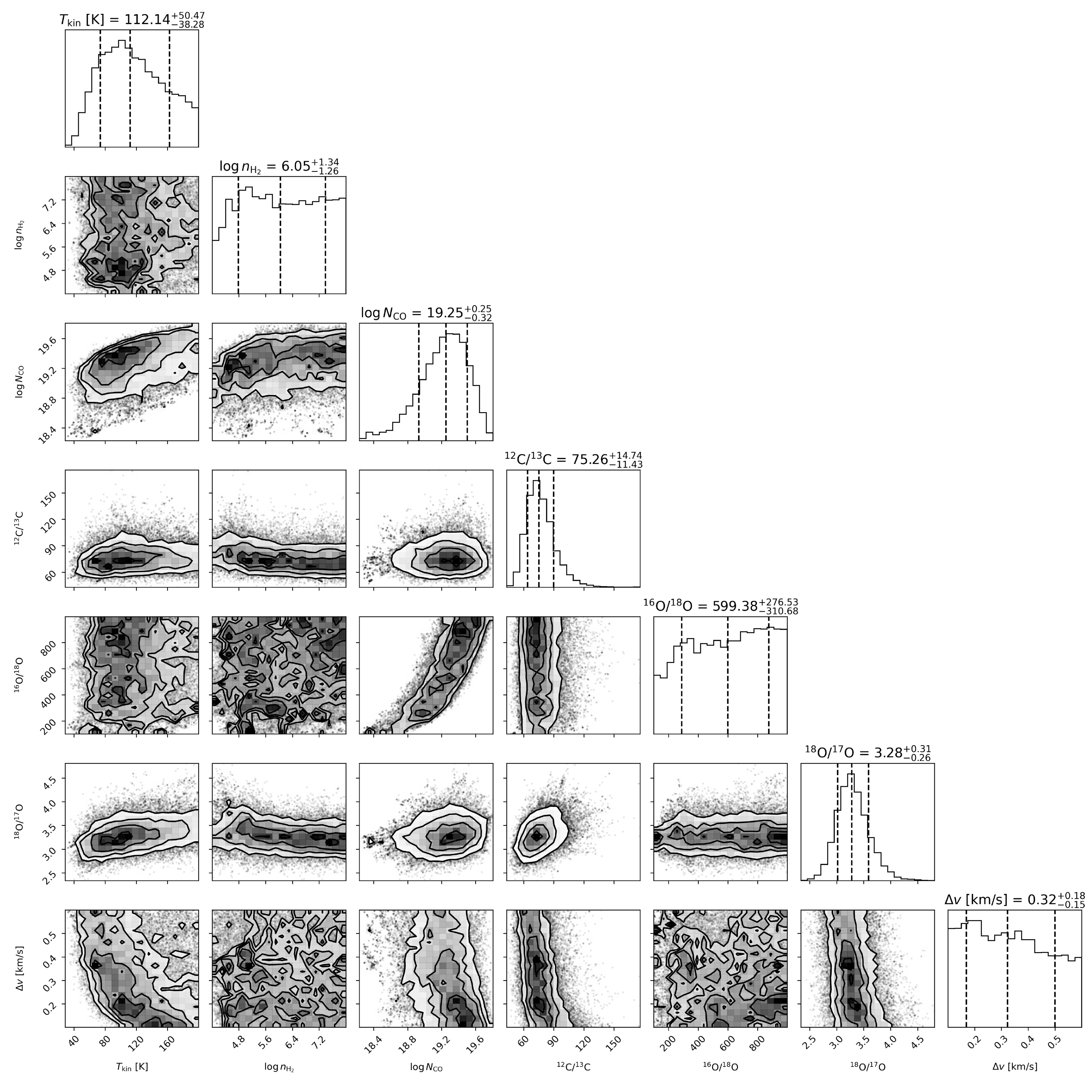 Posterior distributions of the model parameters from the MCMC fit. Diagonal panels show marginalized one-dimensional posteriors; off-diagonal panels show two-dimensional projections that reveal covariances. The 12C/13C and 18O/17O ratios are tightly constrained and largely uncorrelated with other parameters, whereas 16O/18O and ﹩\mathrm{log}{N}_{{\rm{CO}}}﹩ exhibit strong covariance, reflecting the moderate optical depth of C18O(1–0).
