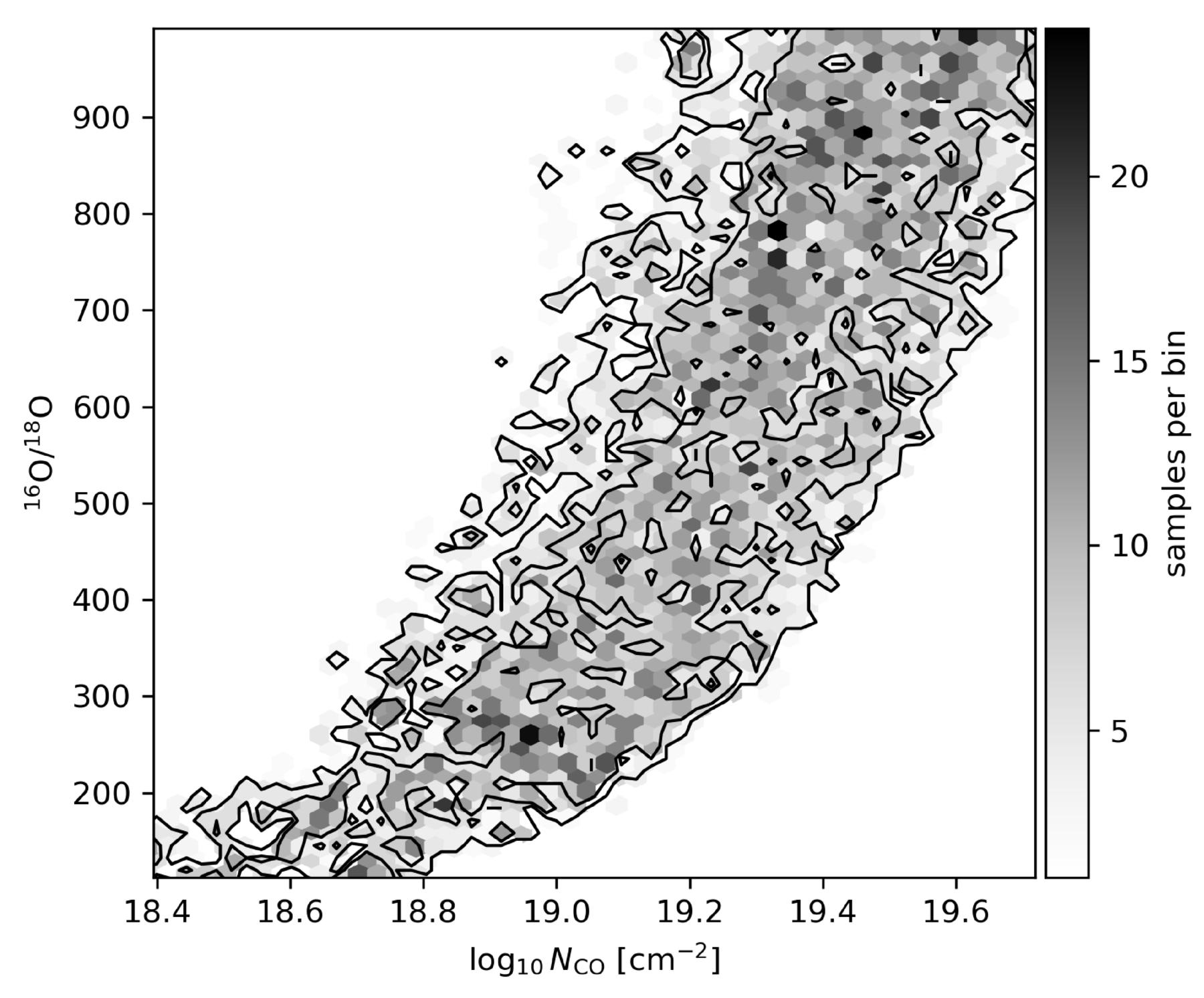 Two-dimensional posterior distribution of 16O/18O versus ﹩\mathrm{log}{N}_{{\rm{CO}}}﹩ from the MCMC analysis. The color scale indicates the number of samples per bin; overplotted contours mark the 68% and 95% credible regions. The elongated ridge illustrates the strong positive covariance between 16O/18O and NCO: larger oxygen isotope ratios can be compensated by higher CO columns while preserving the C18O(1–0) flux.