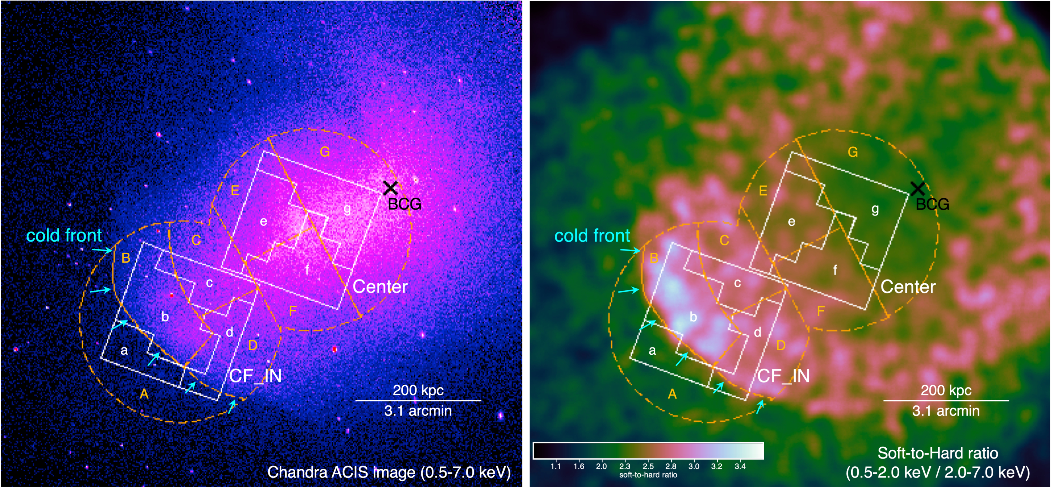 (Top) Chandra image of A3667 in the 0.5–7.0 keV band. White squares show the fields of view of the two XRISM/Resolve observations. White pixellated subregions within the white squares represent detector regions used for spectral extraction. The dashed orange regions represent the sky regions for which the ICM parameters are derived. A black “x” marks the position of the BCG, and cyan arrows indicate the prominent cold front seen in the Chandra image. (Bottom) Soft-to-hard ratio map of A3667, constructed from the ratio of the 0.5–2.0 to 2.0–7.0 keV Chandra images. This map shows spatial variations of the ICM temperature, with brighter regions corresponding to cooler gas.