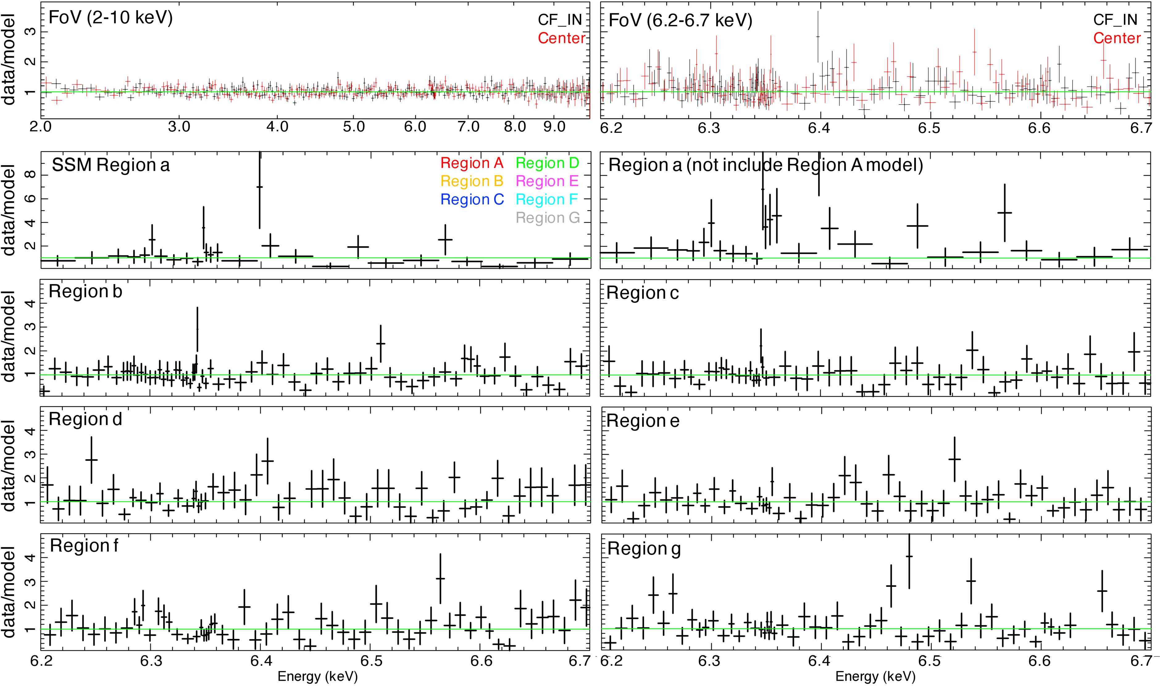 Data-to-model ratio plots corresponding to the spectral fits shown in Figure 2. Alt text: Ten line graphs. In the upper left panel, the x-axis shows the energy from 2.0 to 10.0 keV. The y-axis shows the data-to-model ratio from 0 to 4. In the upper right panel, the x-axis shows the energy from 6.2 to 6.7 keV. The y-axis shows the data-to-model ratio from 0 to 4. In the second row of panels, the x-axis shows the energy from 6.2 to 6.7 keV. The y-axis shows the data-to-model ratio from 0 to 10. In the bottom panels, the x-axis shows the energy from 6.2 to 6.7 keV. The y-axis shows the data-to-model ratio from 0 to 5.