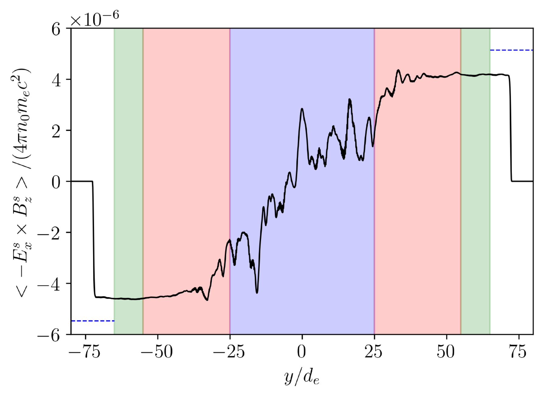 Poynting flux of the superluminal component of the electromagnetic field in a simulation with vd/c = 0.5, ωptcool = 3000. The Poynting flux is computed from the reconstructed spatial field components, which are obtained by performing an inverse Fourier transform for the superluminal part of the spectrum. The purple, red, green, and white colored regions show the central current zone, current transition zone, density transition zone, and vacuum zone, respectively. The values of the Poynting fluxes computed from the full electromagnetic field components in the vacuum zone are shown by the blue dashed lines.