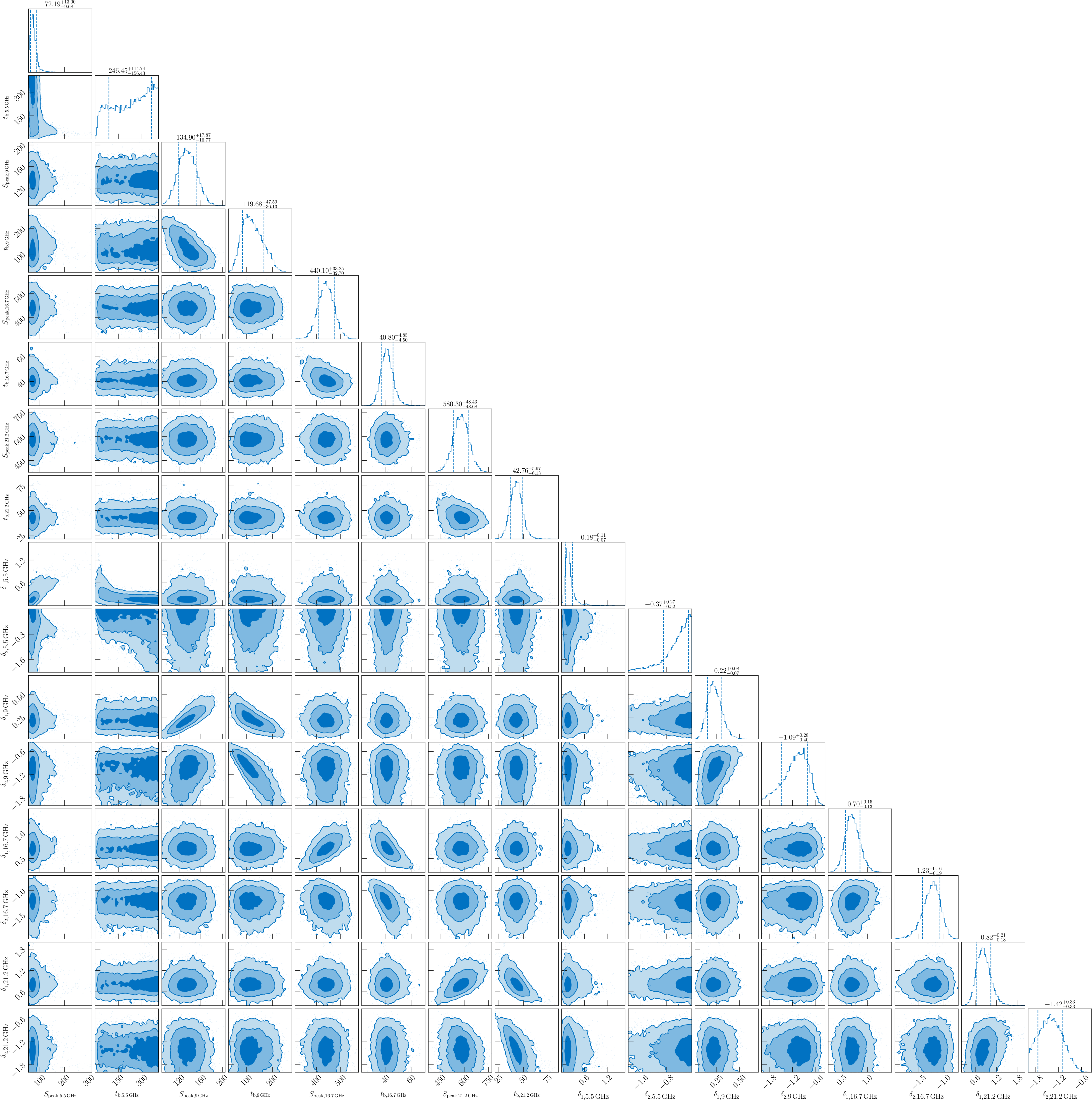 Posterior distributions of the parameters in the smoothly broken power-law model fit to the multifrequency radio light curves, assuming the rise and decay slopes (δ1 and δ2) are independent for each frequency (see Table 4). The dashed vertical lines on the histograms represent the 68% credible intervals of the corresponding marginalized posterior distributions. To help with readability, the parameters from left to right are: Speak,5.5 GHz, tb,5.5 GHz, Speak,9 GHz, tb,9 GHz, Speak,16.7 GHz, tb,16.7 GHz, Speak,21.2 GHz, tb,21.2 GHz, δ1,5.5 GHz, δ2,5.5 GHz, δ1,9 GHz, δ2,9 GHz, δ1,16.7 GHz, δ2,16.7 GHz, δ1,21.2 GHz, and δ2,21.2 GHz.