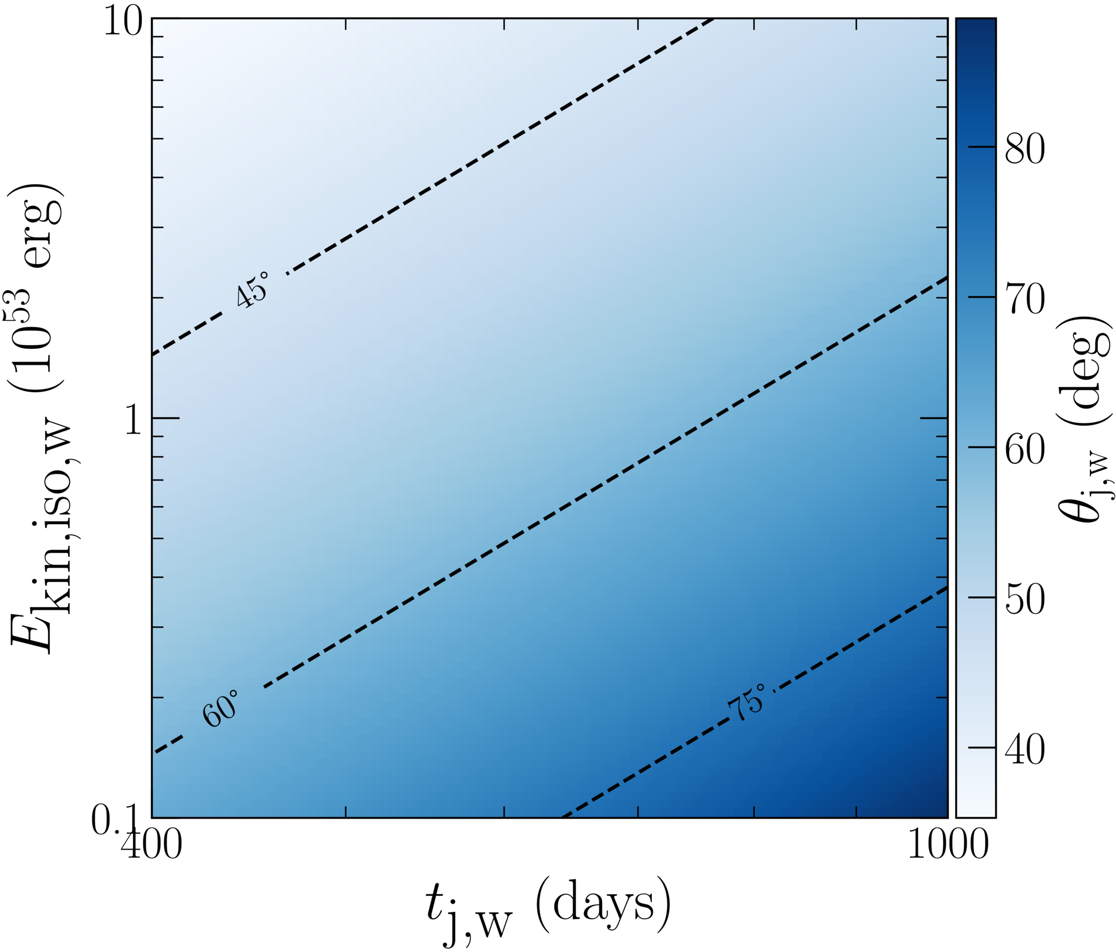 The half-opening angle of the wider component θj,w (in degrees) as a function of the jet break tj,w (days) and isotropic-equivalent kinetic energy Ek,iso,w (erg). The dashed lines indicate the combinations of tj,w and Ek,iso,w that will yield θj,w of 45°, 60°, and 75°. We assume here the redshift and CBM density from Equation (9), effectively performing a relative scaling from the 2﹩\mathop{.}\limits^{\unicode{x000b0}}﹩1 narrow jet.
