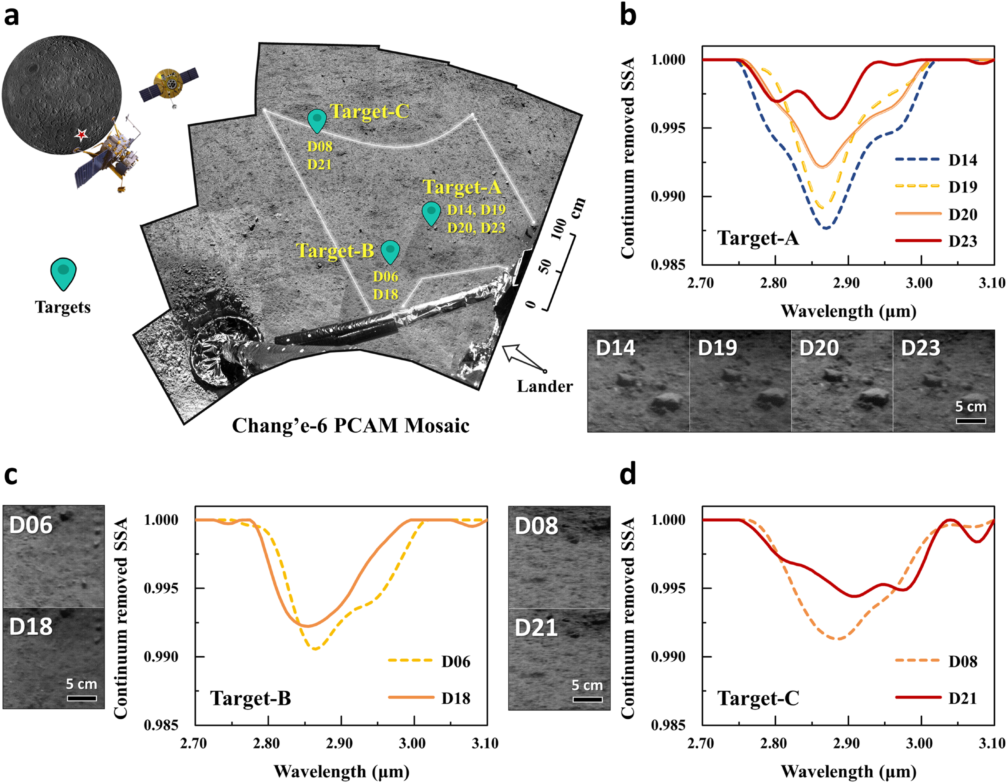 Detection area of LMS and the in situ spectral data of three targets used in this study. (a) The full detection area of LMS is marked with a white box in the Panoramic Camera (PCAM) mosaic image, and the three targets A, B, and C were analyzed by the hyperspectral observation mode with multiple measurements separately. (b) Target-A spectra and images: continuum-removed SSA at the absorption bands of water (OH/H2O; 2.70–3.10 μm) with four measurements (D14, D19, D20, D23 in order). The corresponding CMOS microscopic grayscale snapshots (∼1 mm pixel−1) @ 750 nm are presented as well. (c) Target-B continuum-removed spectra and CMOS images (D06, D18 in order). (d) Target-C continuum-removed spectra and CMOS images (D08, D21 in order).