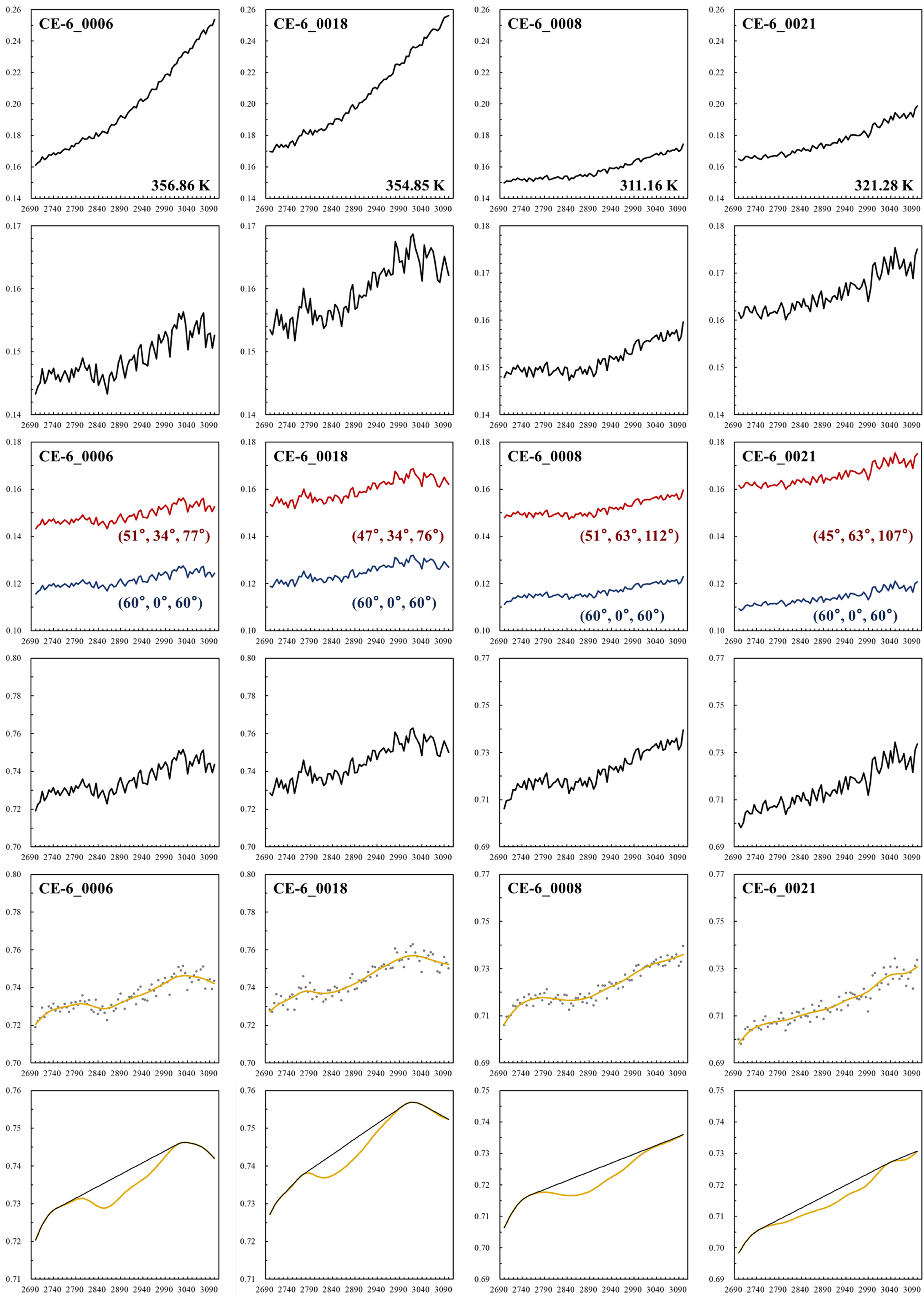 Data processing trace in Target-B (D06, D18 in order) and Target-C (D08, D21 in order). The x-axis is the wavelength in nm, and the y-axis is the reflectance RADF (I/F) and the SSA.