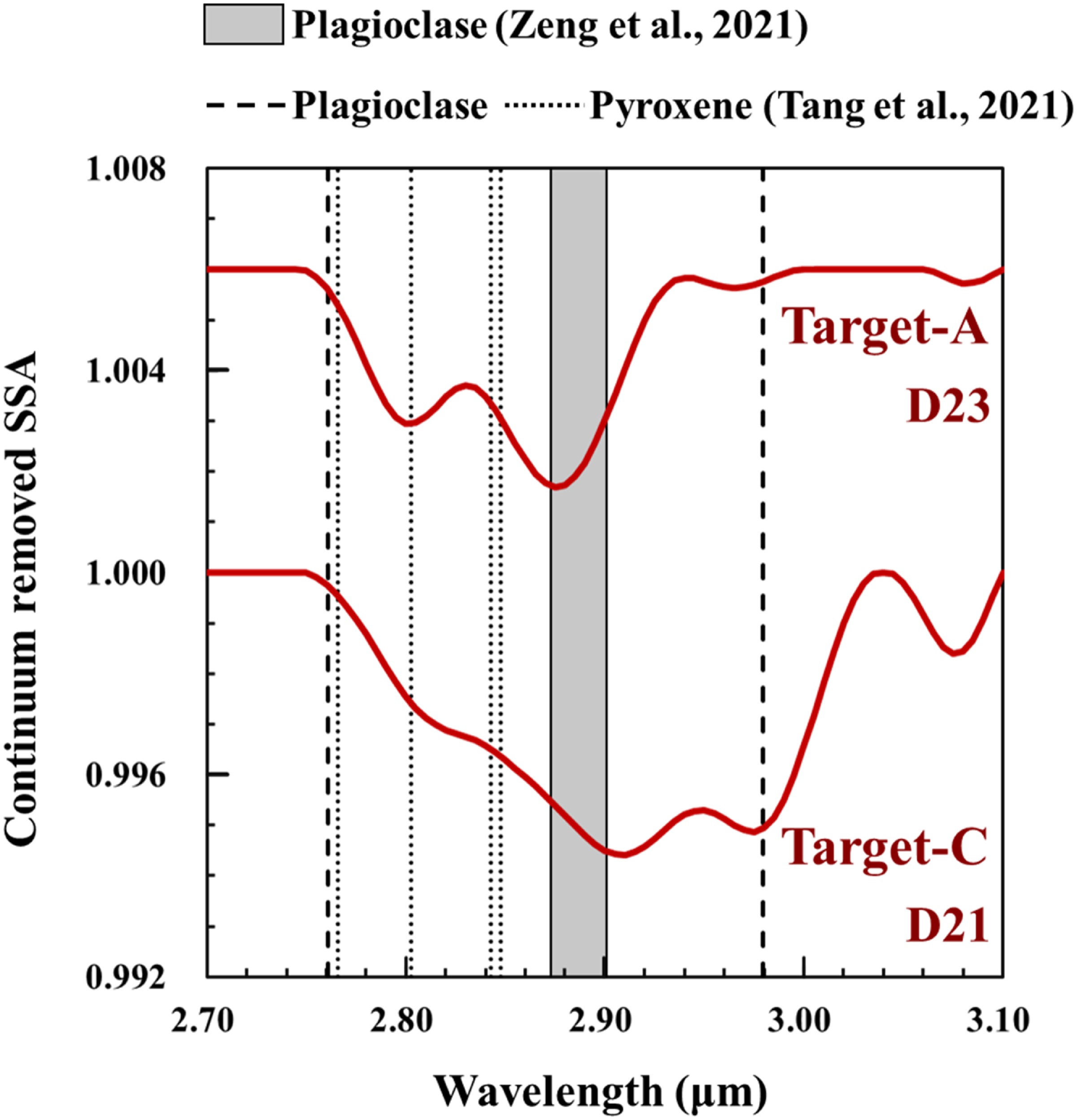 Type Ⅱ spectra and the potential host minerals of water (OH/H2O). The continuum-removed SSAs of Target-A D23 and Target-C D21 are shown as the red solid lines. According to the proton (H+) implantation experiments in the laboratory, new multiple absorption peaks occur in both the terrestrial plagioclase (dashed lines) and pyroxene (dotted lines; H. Tang et al. 2021). The gray area also corresponds to the peak centers of irradiated plagioclase, which varied with temperatures (20℃–100℃, turns to shorter wavelengths; X. Zeng et al. 2021). Target-C D21 was estimated with 33 ppm water content, so the spectral features are perhaps still influenced by a few adsorbed water molecules (H2O) and even some adsorbed hydroxyl (OH) on the solid surface of lunar mineral grains. When the water content further decreased to 26 ppm in Target-A D23, its spectral features may better represent the OH groups within lunar mineral crystal lattices.