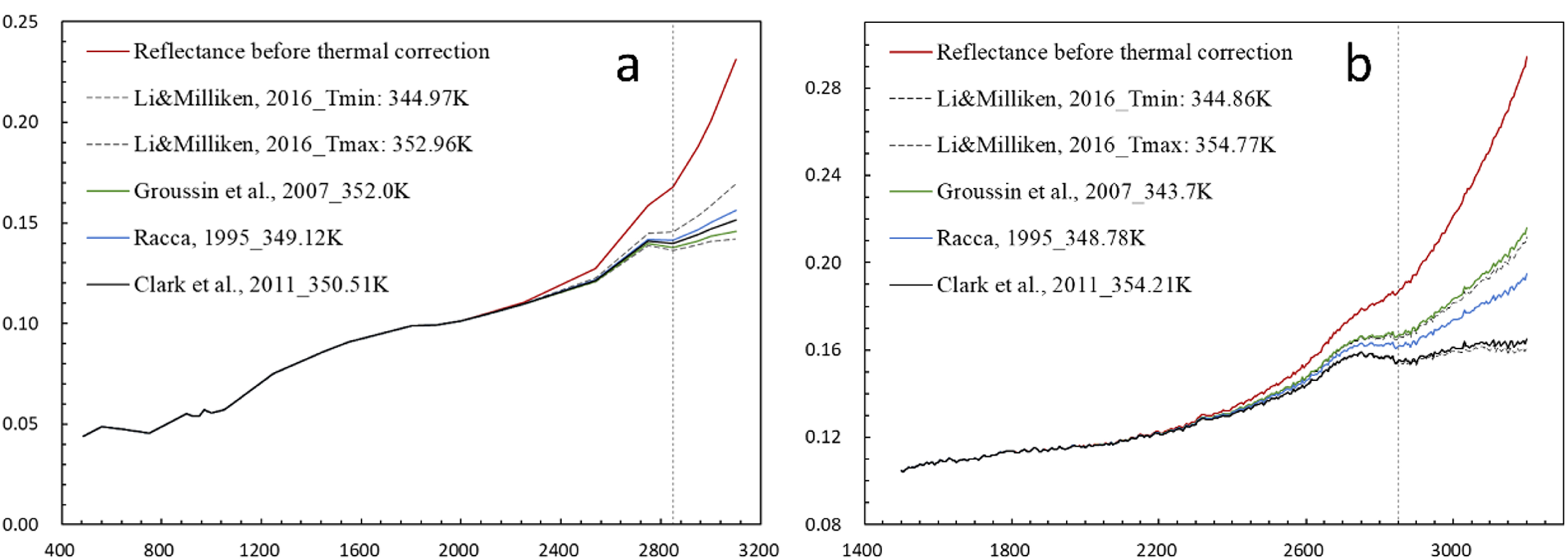 Thermal detection and correction using different models. (a) D049 detection point in FVSMO multispectral mode. (b) D03 detection point in FBO mode. The x-axis is the wavelength in nm, and the y-axis is the reflectance RADF (I/F).