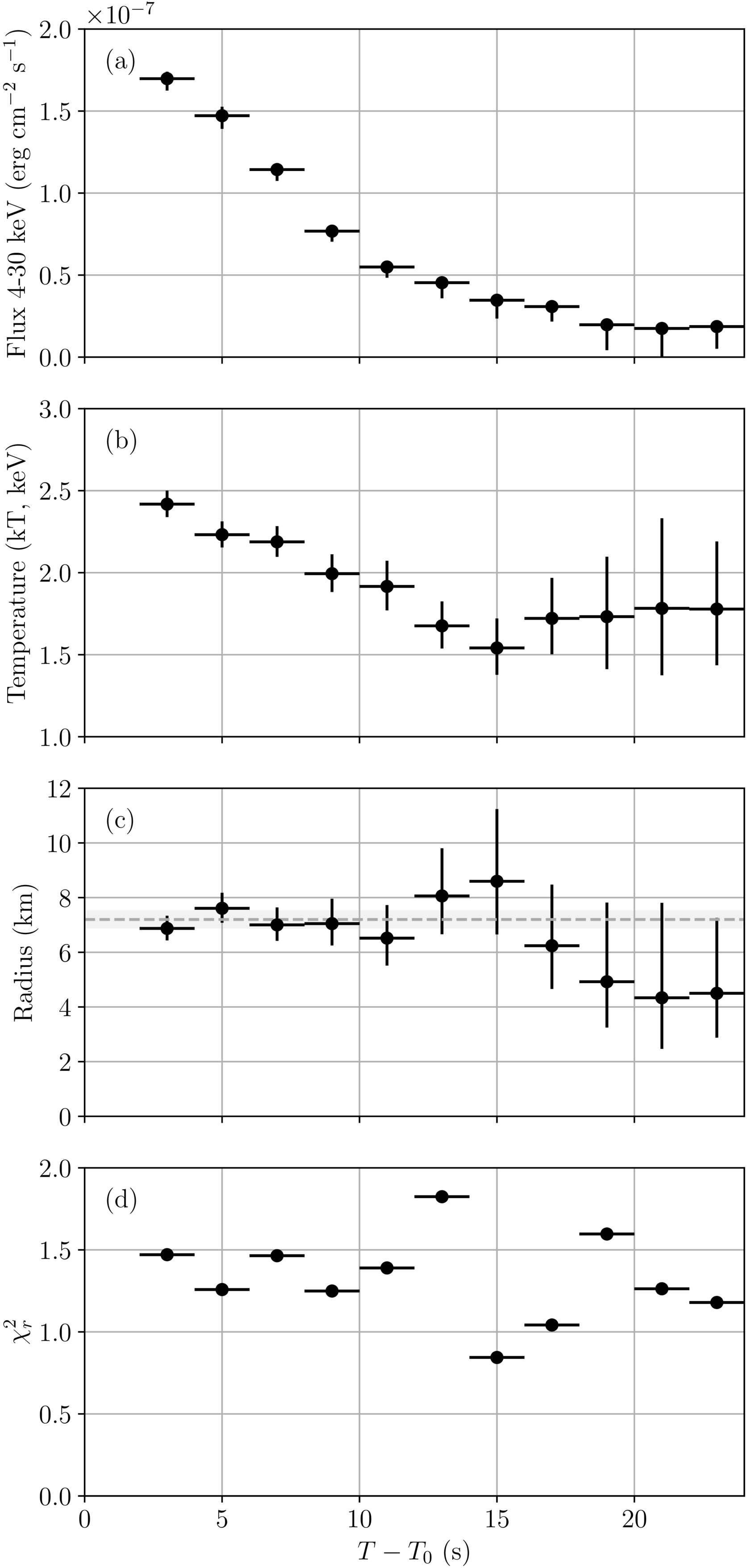 Evolution of time-resolved spectroscopy with a bbodyrad model, with (a) the flux between 4 and 30 keV, (b) the temperature kT, (c) the emission radius, assuming a distance of 3 kpc, with a constant radius shown as a dashed line, and (d) the reduced chi square ﹩{\chi }_{r}^{2}={\chi }^{2}/17﹩ degrees of freedom.