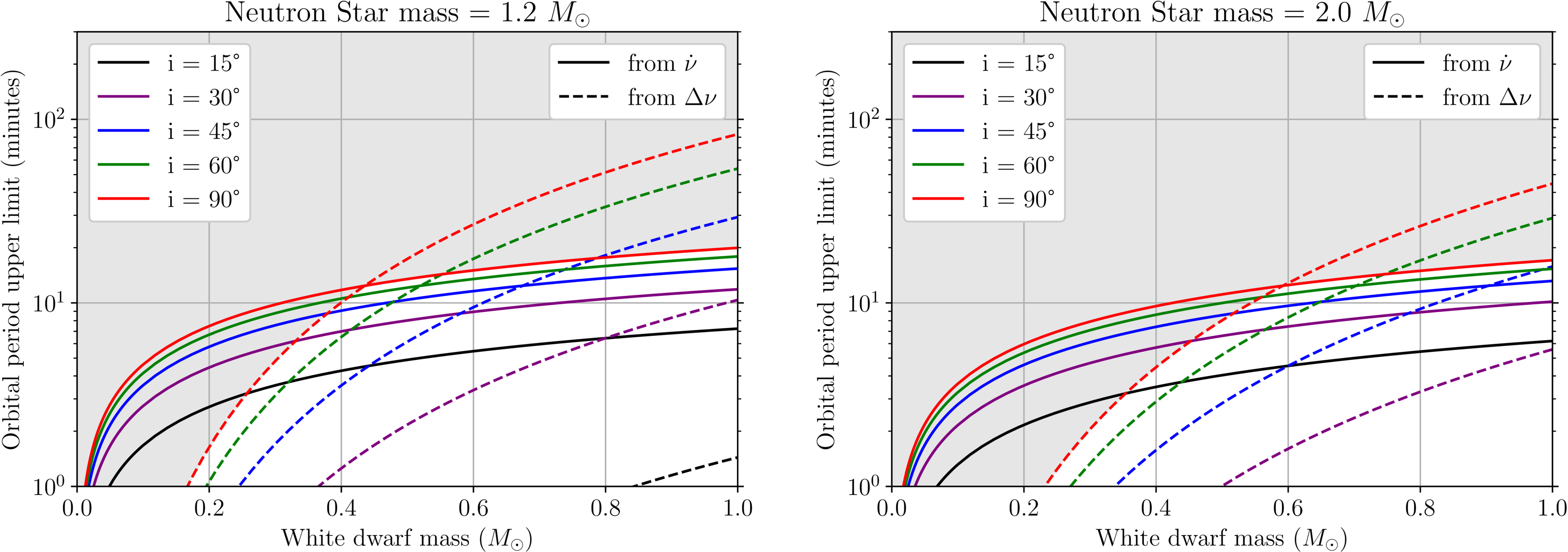 Upper limit of the orbital periods set by the Δν (dashed lines) and ﹩\dot{\nu }﹩ (solid lines) as a function of MWD, at different inclinations i, and for MNS = 1.2 (left) and MNS = 2.0 M⊙ (right). The areas of the parameter space incompatible with the hypothesis that both Δν and ﹩\dot{\nu }﹩ originate from orbital motion are represented in gray.