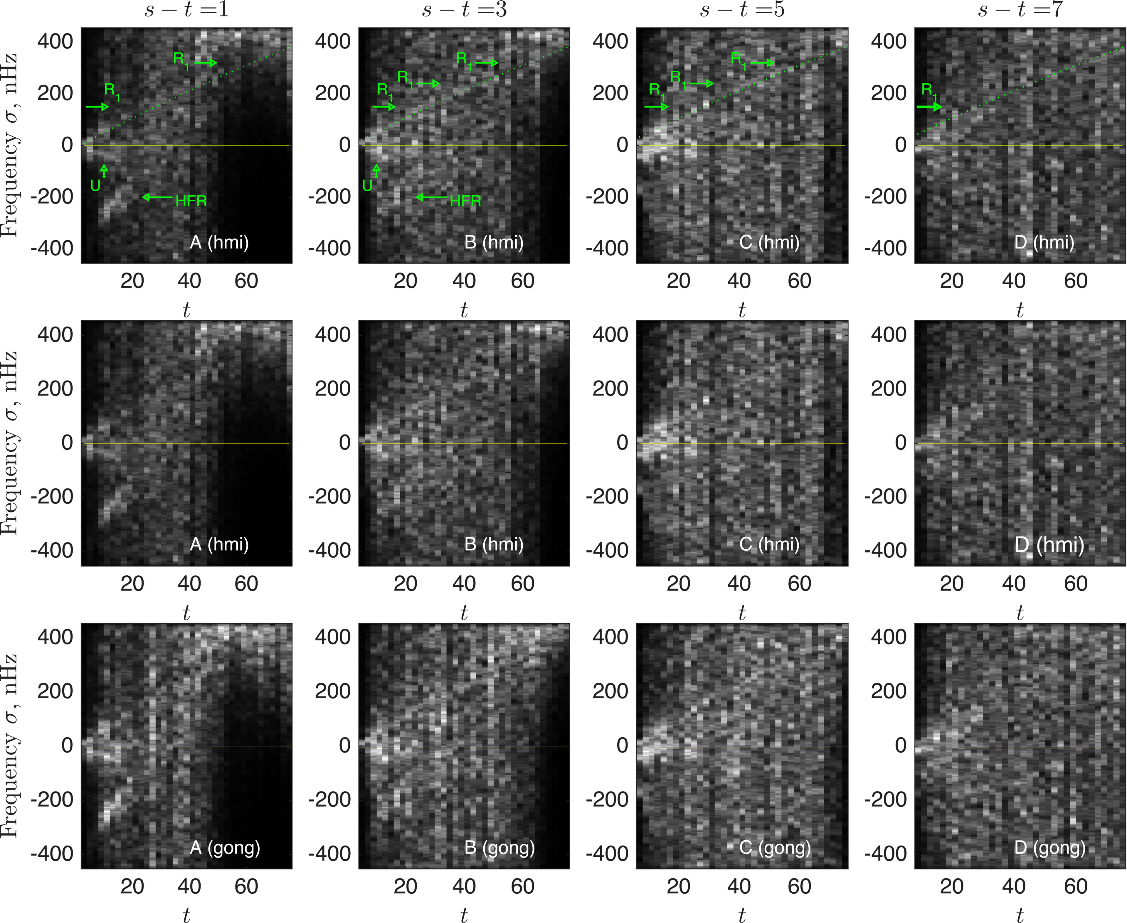 Power spectra of vortical motions obtained using modes in the range ℓ ∈ [70, 200] and 1293 ≤ ωnℓ/(2π) ≤ 5500 μHz. A uniform tracking rate of Ω⊙/(2π) = 456 nHz was applied to retrieve these measurements. Vertical axes denote temporal frequency (nHz), and horizontal axes are azimuthal orders at fixed s − t (stated in the title of the uppermost panels). Arrows direct the attention of the reader to the following features: the previously detected high-frequency retrograde ridge (marked as HFR; C. S. Hanson et al. 2022); one prograde feature; and one marked by green arrows and labeled R1, whose dispersion relation is given by σ1 = −0.0093t2 + 5.855t − 7.419 nHz (marked as green dots in the uppermost panels). A faint higher-frequency prograde ridge, parallel to R1, is seen over the azimuthal-order range t ∈ [30, 60]; we do not point it out because the signal-to-noise ratio is marginal. Some features are repeated in independent channels, i.e., at different values of s − t. A previously undetected ridge starting at zero frequency and becoming increasingly retrograde (marked as U) is also visible in the proximity of the HFR feature. This may be an Alfvén–Rossby wave although further considerations are beyond the scope of this Letter. The first row is annotated in order to draw the attention of the reader to the features; the latter two rows show the spectra with no markings. The raw spectra are averaged in temporal frequency using a 21.4 nHz boxcar filter. The horizontal yellow line marks zero temporal frequency; features above this are prograde and below it are retrograde. There are indications of a richer spectrum of ridges although these will be pursued in a future effort.