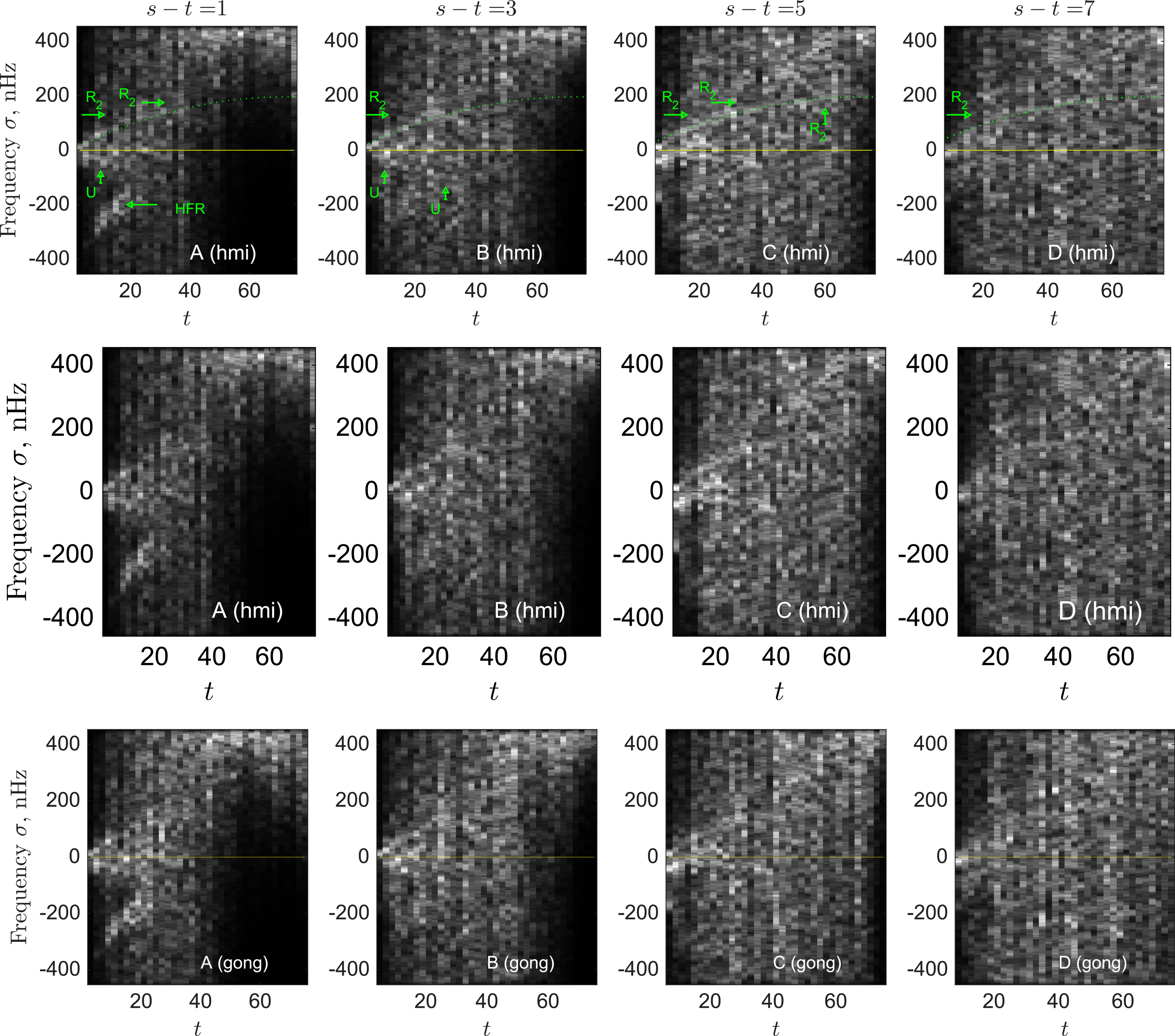 Power spectra of vortical motions obtained using modes in the range ℓ ∈ [70, 200] and 1293 ≤ ωnℓ/(2π) ≤ 2500 μHz, a smaller mode-frequency range than used to produce the plots in Figure 1. The depth sensitivity of this mode sum is different from that of Figure 1, as shown in the lowest panel of Figure 4. A uniform tracking rate of Ω⊙/(2π) = 456 nHz was applied to retrieve these measurements. Vertical axes denote temporal frequency (nHz), and horizontal axes are azimuthal orders at fixed s − t (stated in the title). Arrows direct the attention of the reader to the following features: the previously detected high-frequency retrograde feature (marked as HFR; C. S. Hanson et al. 2022) and the retrograde ridge U identified in Figure 1, which is less prominently visible here. A new prograde branch, different from the mode seen in Figure 1, is denoted as R2 and described by the dispersion relation σ2 = −0.0379t2 + 5.45t − 0.0776 nHz (marked as green dots in the uppermost panels). Unlike R1, which is seen to be steadily increasing with wavenumber, R2 appears to saturate at ∼210 nHz. Some features are repeated in independent channels, i.e., at different values of s − t. The first row is annotated in order to draw the attention of the reader to the features; the latter two rows show the spectra with no markings. The raw spectra are averaged in temporal frequency using a 21.4 nHz boxcar filter. The horizontal yellow line marks zero temporal frequency; features above this are prograde and below it are retrograde. There are indications of a richer spectrum of ridges although these will be pursued in a future effort.