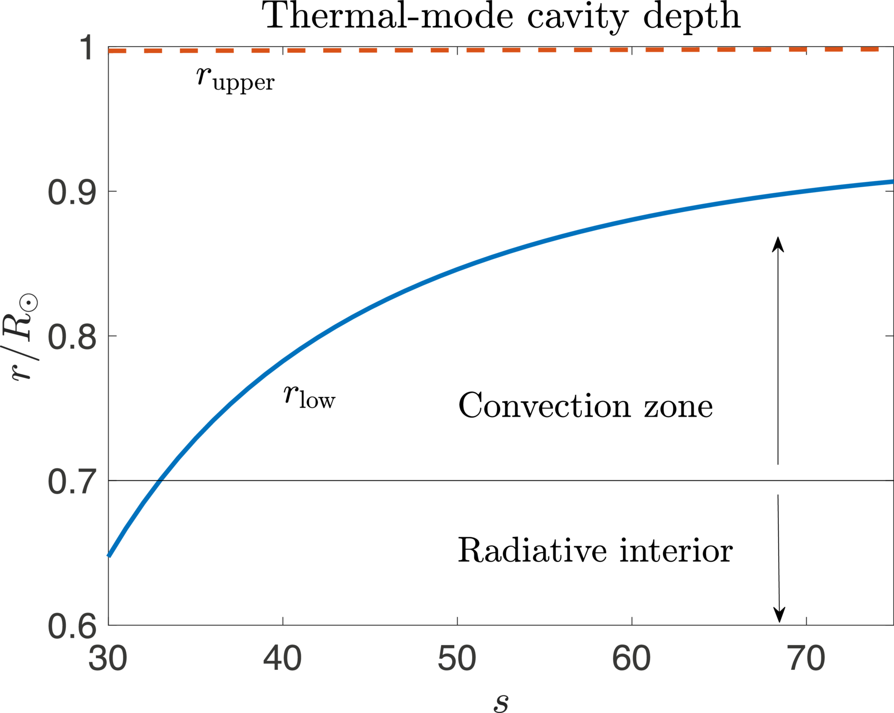 Rough estimates of the upper rupper (dashed red line) and lower rlow (solid blue line) turning points of the thermal mode R2 shown in Figure 2. We use the frequencies and wavenumbers of the modes as measured along the ridge as inputs to the scaling relations rlow/R⊙ ≈ 1–3Ω⊙/(sσ) and rupper/R⊙ ≈ 1–5σ/(16sΩ⊙) (B. W. Hindman & R. Jain 2022). Although these theoretical relations describe a cavity that straddles the entire solar convection zone, thermal modes are not observed in the shallow surface layers r/R⊙ ≳ 0.98. Thus, we cannot comment on the depth penetration of these waves and the thermal-mode cavity size unless we directly observe them propagating at those layers. If the modes were to indeed propagate as deeply as suggested in this figure, it would suggest that the bulk is effectively nonconvecting.