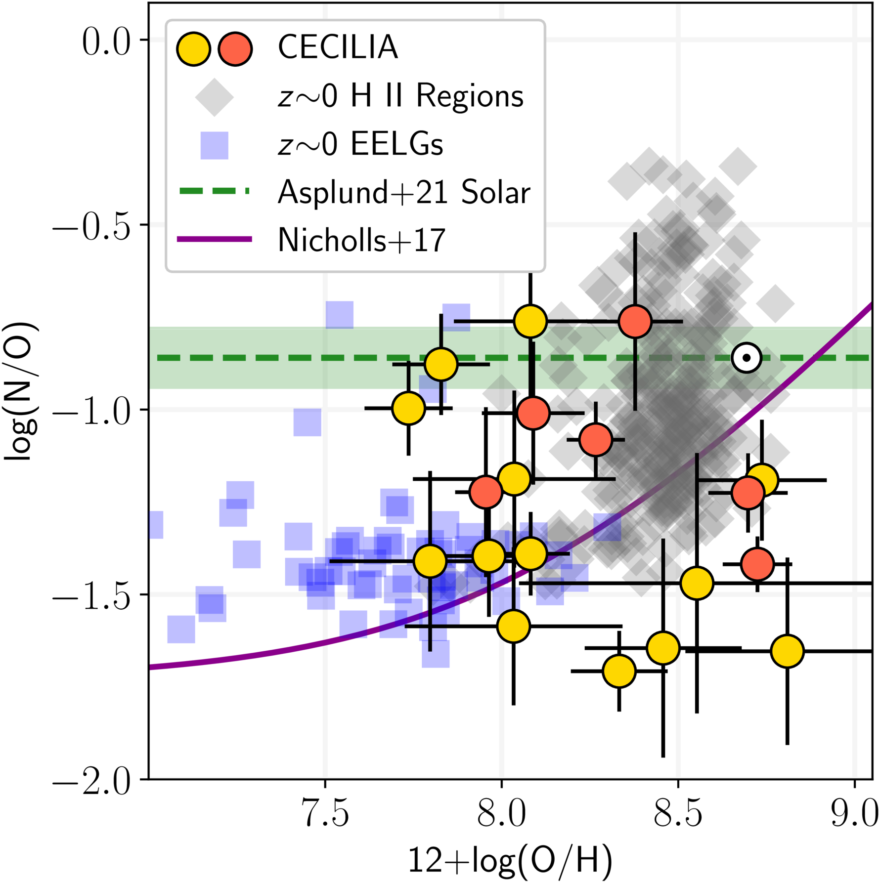 The N/O–O/H abundance trends in the CECILIA galaxies, local star-forming nebulae (gray diamonds and blue squares), Galactic stars (solid purple line, from D. C. Nicholls et al. 2017), and the Sun (green dashed line and circled dot, from M. Asplund et al. 2021). The color of the CECILIA galaxies represents the number of direct Te measurements; see Figure 6. The CECILIA galaxies generally scatter around the primary plateau at log(N/O) ∼ −1.45 dex and the secondary N/O locus observed in metal-rich H II regions. The low N/O at 12 + log(O/H) > 8.5 dex in some CECILIA galaxies could be a signature of high SFE. High N/O at 12 + log(O/H) < 8.0 has been reported in other high-z galaxies and is observed in a portion of the CECILIA sample, but it is infrequently observed at z ∼ 0.