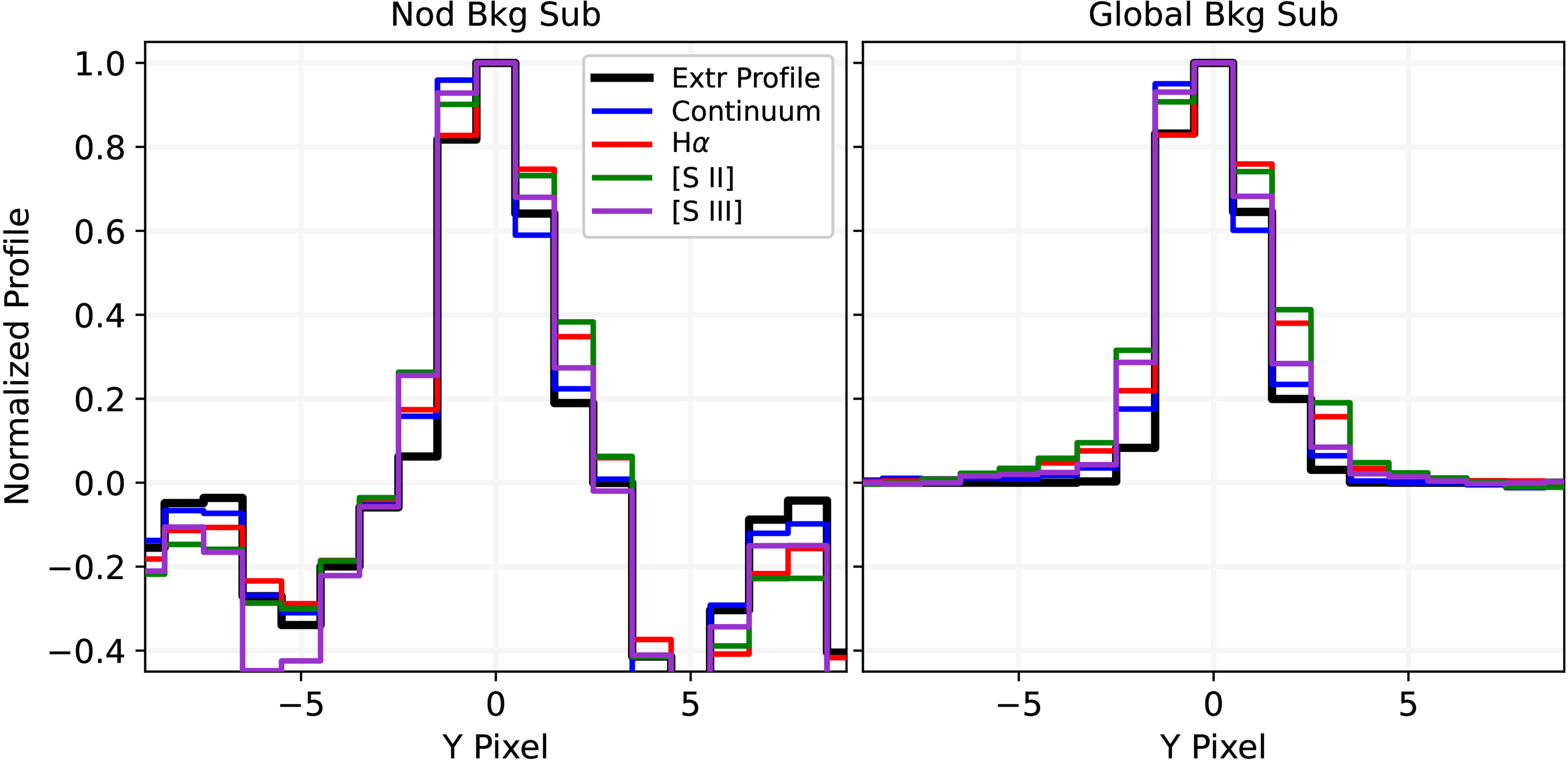 Emission in the spatial direction of the 2D NIRSpec data of the galaxy BX474. The profiles are normalized by the peak emission measured in the center row. The left and right panels compare the profiles obtained from the nod and global background subtraction approach, respectively. The spatial profiles plotted are Hα (red), [S II] λ6718 (green), [S III] λ9533 (purple), the stellar continuum (blue), and the optimal 1D extraction profile determined from MSAEXP (black). The nod background-subtracted data show self-subtraction residuals in both the continuum and emission lines, while the global background method described in Section 2.4 conserves the extended emission.