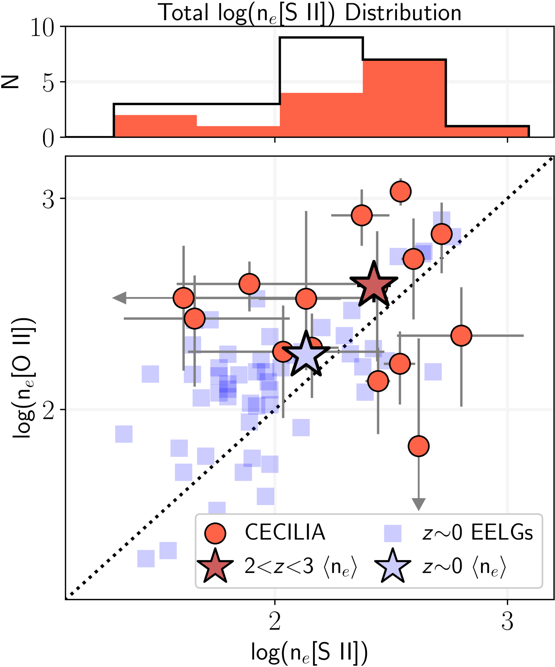 Density trends in the CECILIA galaxies (red circles) and local EELGs (light-blue squares). Each point represents the simultaneous measurement of ne[O II] and ne[S II], and the dotted line reflects equivalent densities. The dark-red and light-blue stars are the average ne measured in CECILIA and at z = 0, respectively. The top panel plots the histogram distribution of 23 ne[S II] measurements in the CECILIA sample, where the red bins represent the galaxies with simultaneous ne[O II]. In agreement with previous findings, the direct measurements of ne[S II] and ne[O II] from the CECILIA galaxies indicate that the ISM density at Cosmic Noon is elevated with respect to the ne measured in the local Universe. Furthermore, ne[S II] and ne[O II] show good agreement, as may be expected for two ions primarily originating in the same ionization zone.